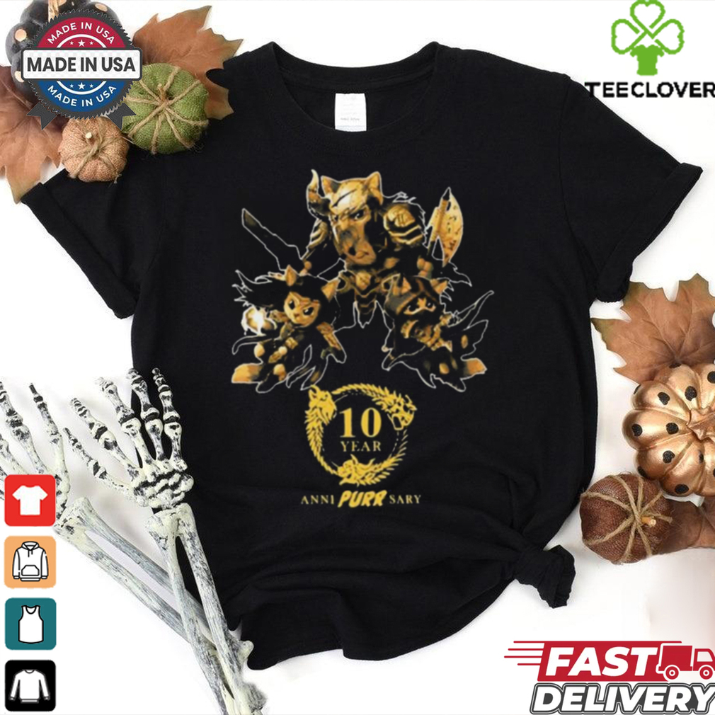 More often than not, I don’t even make it up the 10 Year Anni Purr Sary 2024 Shirt to my room to change! The moment I’m in the door, I set my stuff down and kick off my shoes while simultaneously removing my bra (usually from within my shirt and out through one of the sleeves…)I leave a stack of old comfy tshirts and yoga pants in the laundry room so it takes no more than 3 minutes to get in the door, lock it – and continue to literally “shed my entire day” till I find myself naked in the laundry room to finish off my “evening attire” before I slip into my corner of the couch with my favorite throw blanket and pillow.