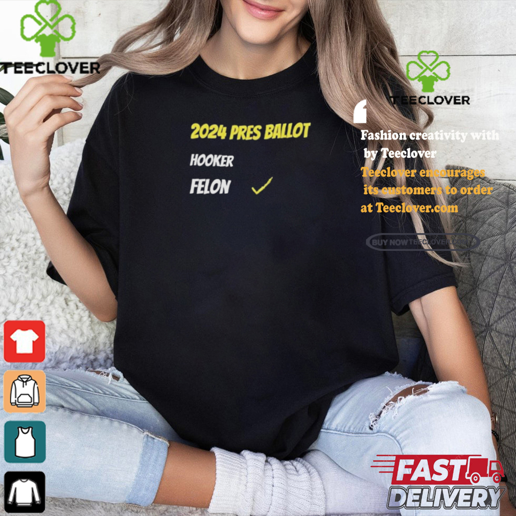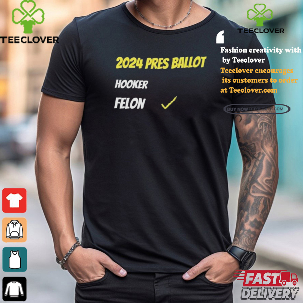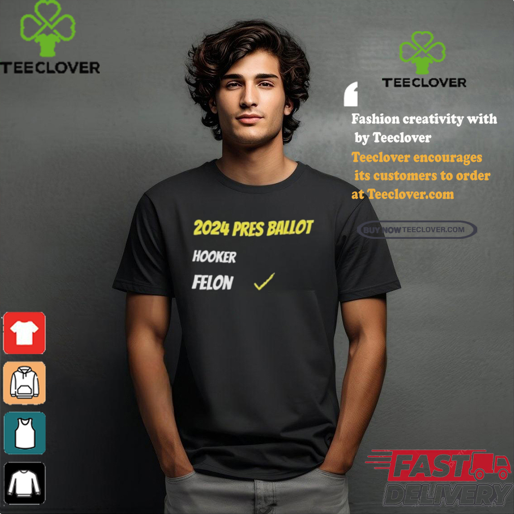 My cat, Tealc, is 2024 Pres Ballot Hooker Felon Shirt now for three years was so attached to me it was eerie. I was going through a stressful time years ago and it had started to affect my sleep. On several occasions I would wake up gasping for air and full of anxiety. My wife would wake me up out of a dead sleep sometimes and tell me I had stopped breathing. One night while I slept in had apparently done just that. Most of this I learned from my wife who witnessed it since I was asleep.