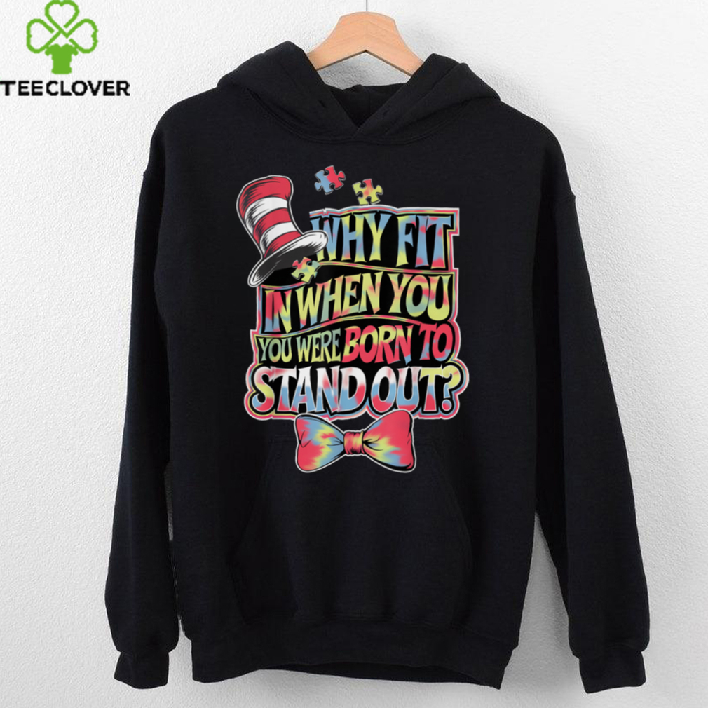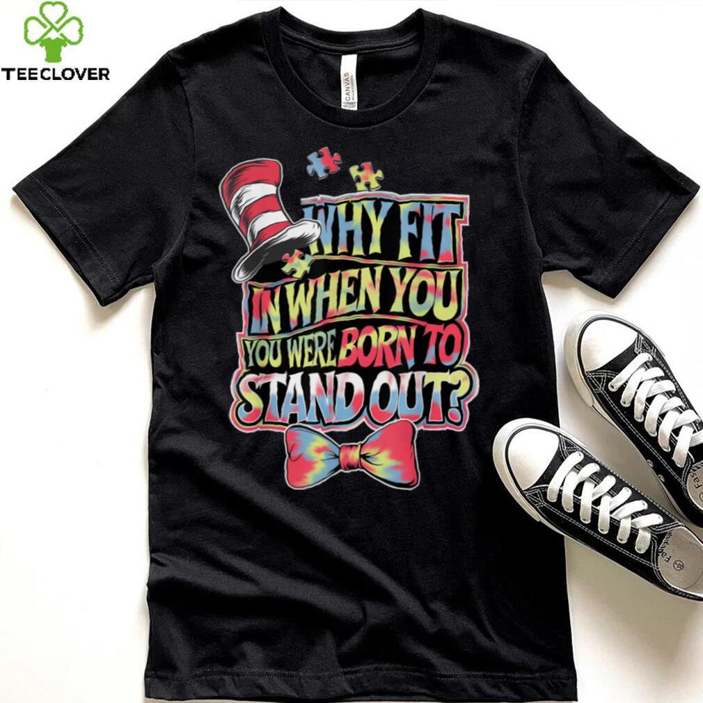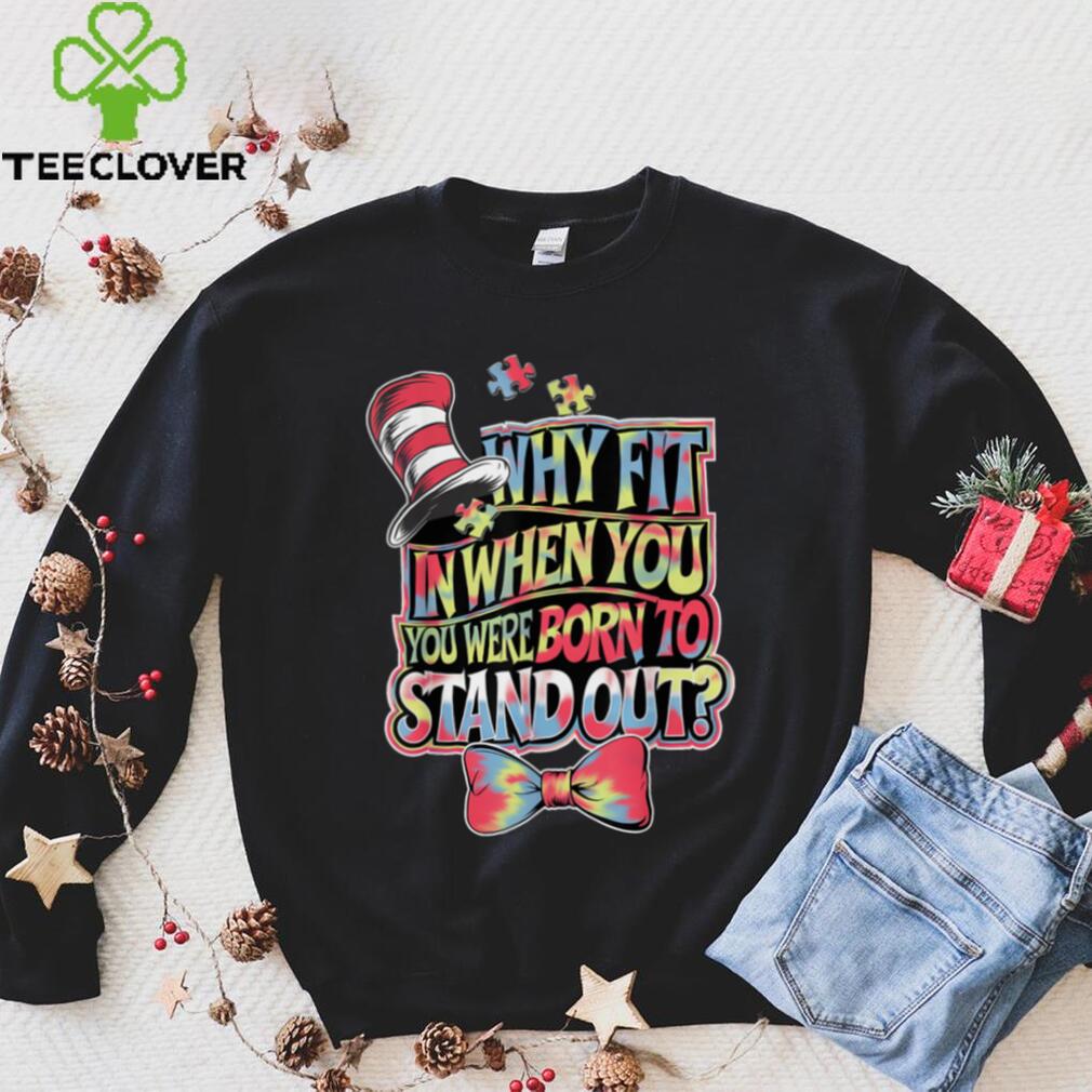 The Autism Awareness Why Fit In Doctor Teacher Cat In Hat Cool T-Shirt (1) cleverly combines the iconic imagery of Dr. Seuss’s “The Cat in the Hat” with a powerful message of autism awareness. This shirt, featuring the phrase “Why Fit In” alongside Seuss-inspired elements, serves as a visually engaging and thought-provoking statement about neurodiversity. It encourages wearers and those who see it to challenge the societal pressure to conform and instead celebrate the unique perspectives and strengths of individuals with autism. Imagine wearing this shirt, its design sparking conversations about autism, the importance of embracing individuality, and the need for greater understanding and acceptance. It’s a statement that you champion neurodiversity and believe in the beauty of being different.