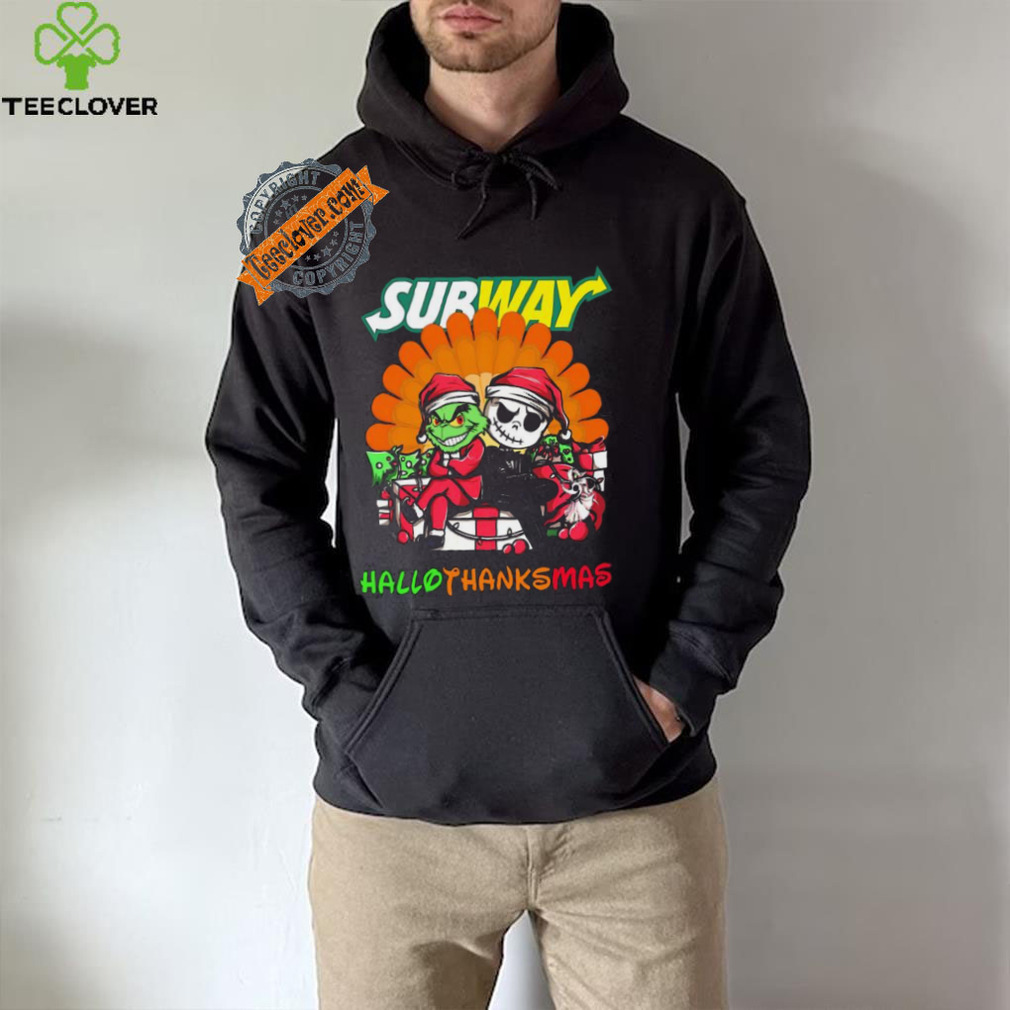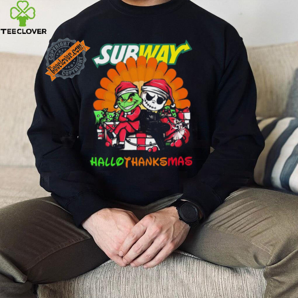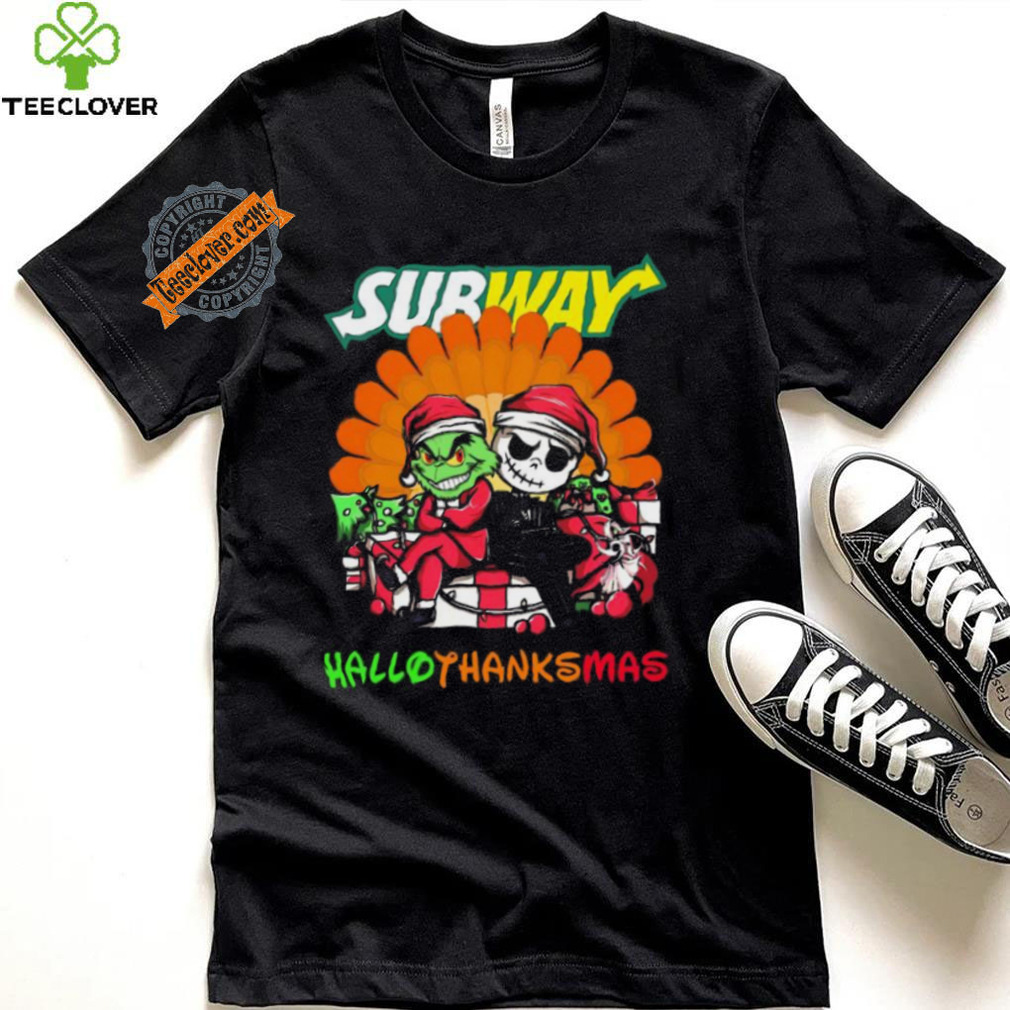 Everything that was in that movie is what my family did at Christmas. Mom and dad took my sisters, Lori and Tracy and I to see Santa so we could tell him what we wanted for Christmas. Yes the Baby Grinch and Jack Skellington Subway logo Hallothanksmas 2024 shirt were long and my older sisters, two years older than me, would be with me looking after me as we moved up the line toward Santa and just like in the movie, the closer we got, the scarier Santa was. βDonβt be scared RJ, Santa is nice okay, donβt be scared now, weβre here,β Tracy would say as we moved closer. Of course that didnβt help me, but I was okay when I got there. I never cried. Mom and dad also took us to the Santa Claus parade. They made sure Tracy went pee before the parade because dad didnβt want to take her somewhere to find a bathroom during the parade. Something that he would have had to do if she didnβt go. And she went a lot. We would walk and look into the department store windows and see the toys and moving elves that the kids saw in the movie. Like Ralphie, I would get mom to order things for me from the comics, neat little gadgets they advertised.