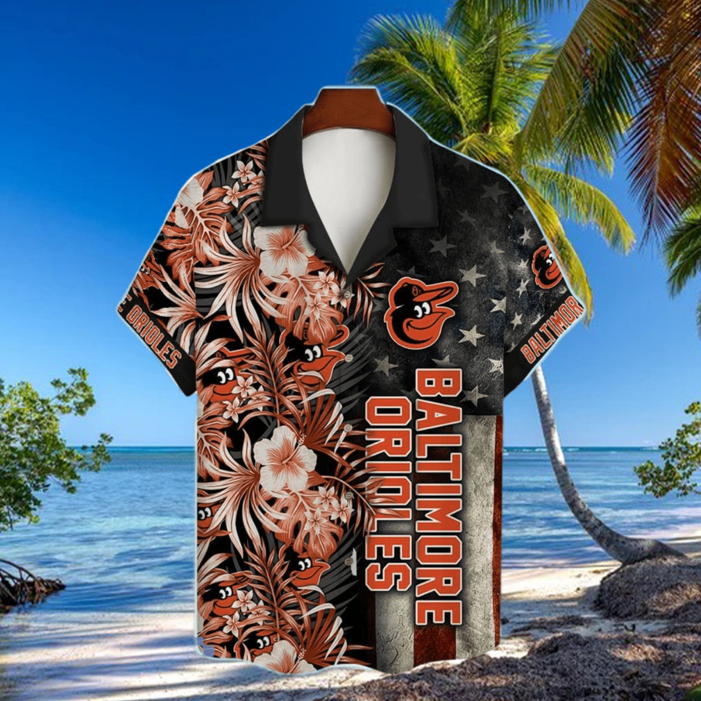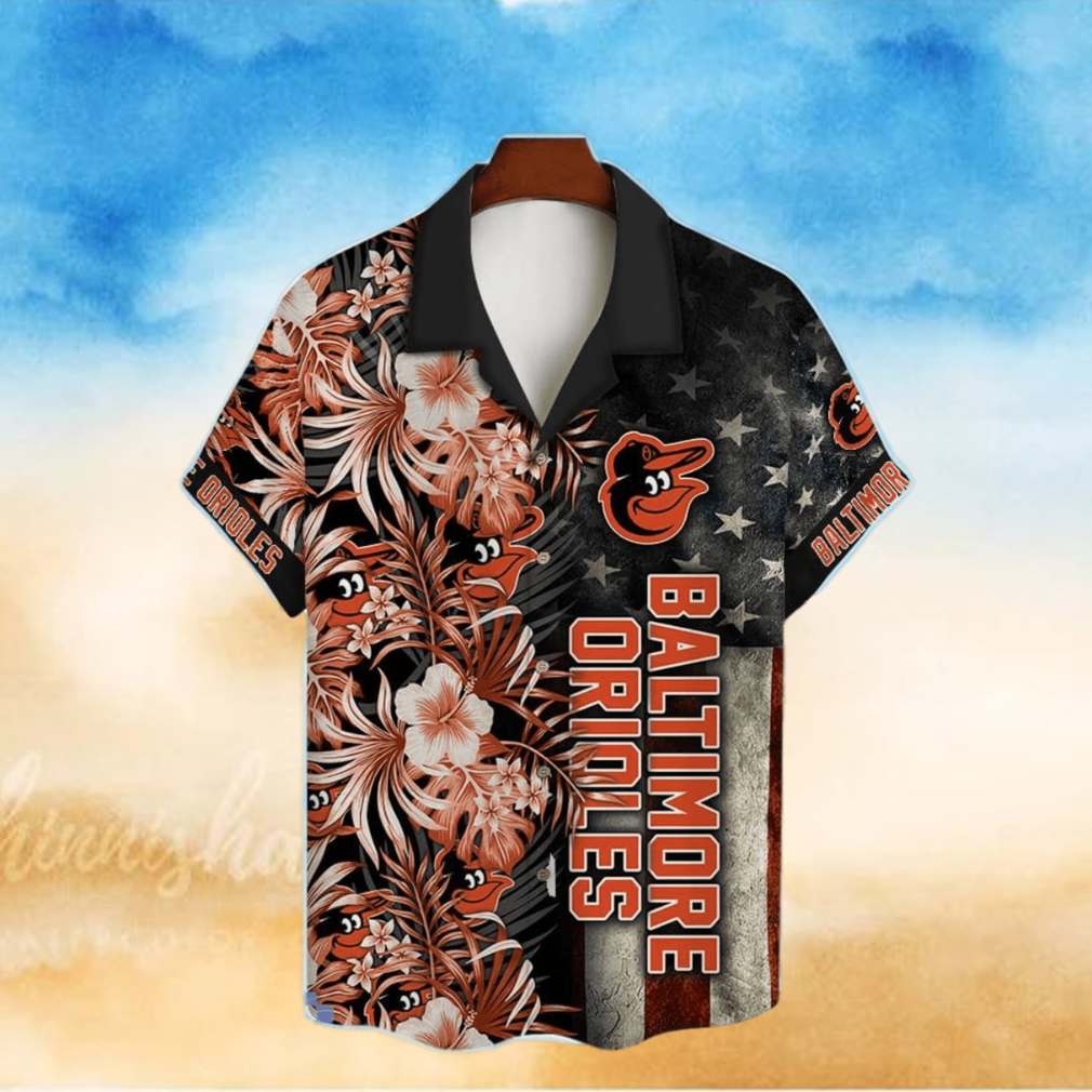 ()Baltimore Orioles Hibiscus Flower American Flag Pattern Black Hawaiian Shirt,