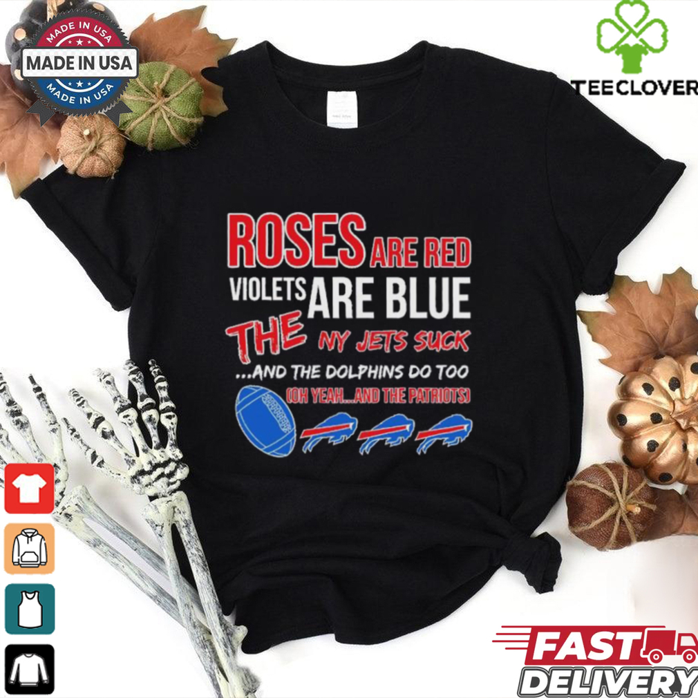 Alternative or streetwear labels like the Bills roses red violets blue the NY Jets suck the Dolphins do too shirt found at Dover Street Market and Ssense generally do not present shows at fashion week. Sometimes, these brands setup small showrooms during Fashion Weeks to allow store buyers to see their products in person. Other brands simply send stores images of samples and order sheets, which the buyers then use to decide on purchase quantities. Production times vary widely in this category, as some streetwear brands can produce T-shirts in a period of days, while others need months to develop complicated pattern work and receive orders from international factories.