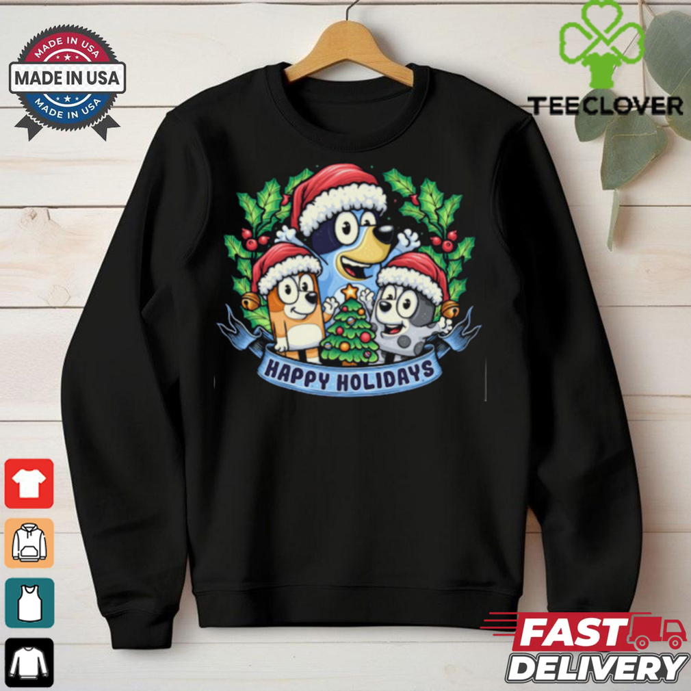 While this might seem like sound judgment, Blueyy Happy Holidays Blueys T Shirt Recovered brand new t tshirt professionals as well as potential t tee business people bypass this measure and also only decide on any type of regular font style they could possess being located around. It is actually apparent in their end results; what might possess been actually an exciting t tshirt concept finishes up being actually monotonous as well as amateur-looking. If you’re cautious to opt for a typeface that works with the material of your words, nevertheless, you can easily prevent this future as well as your t-shirts will certainly consistently be actually one action ahead of time of your competitors.