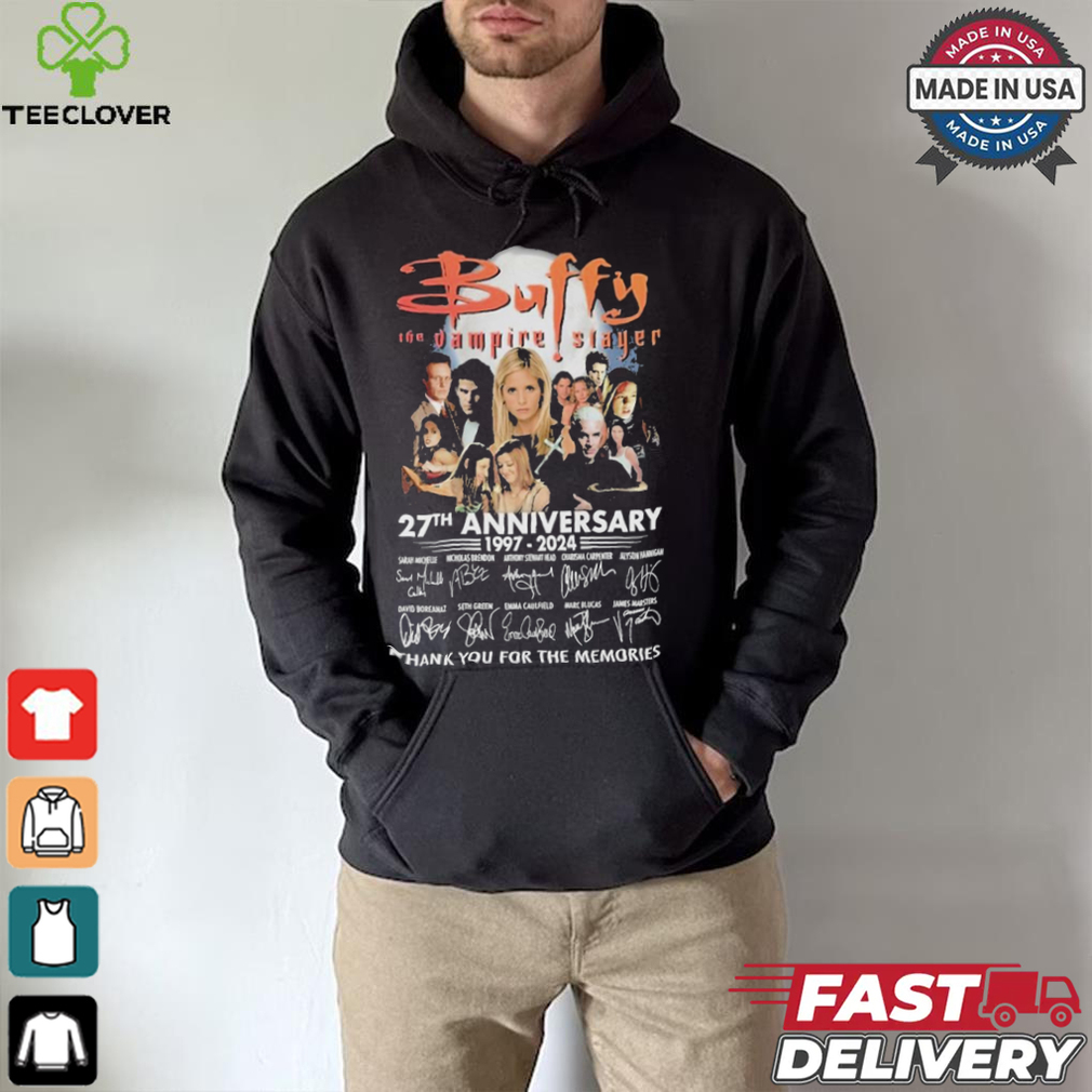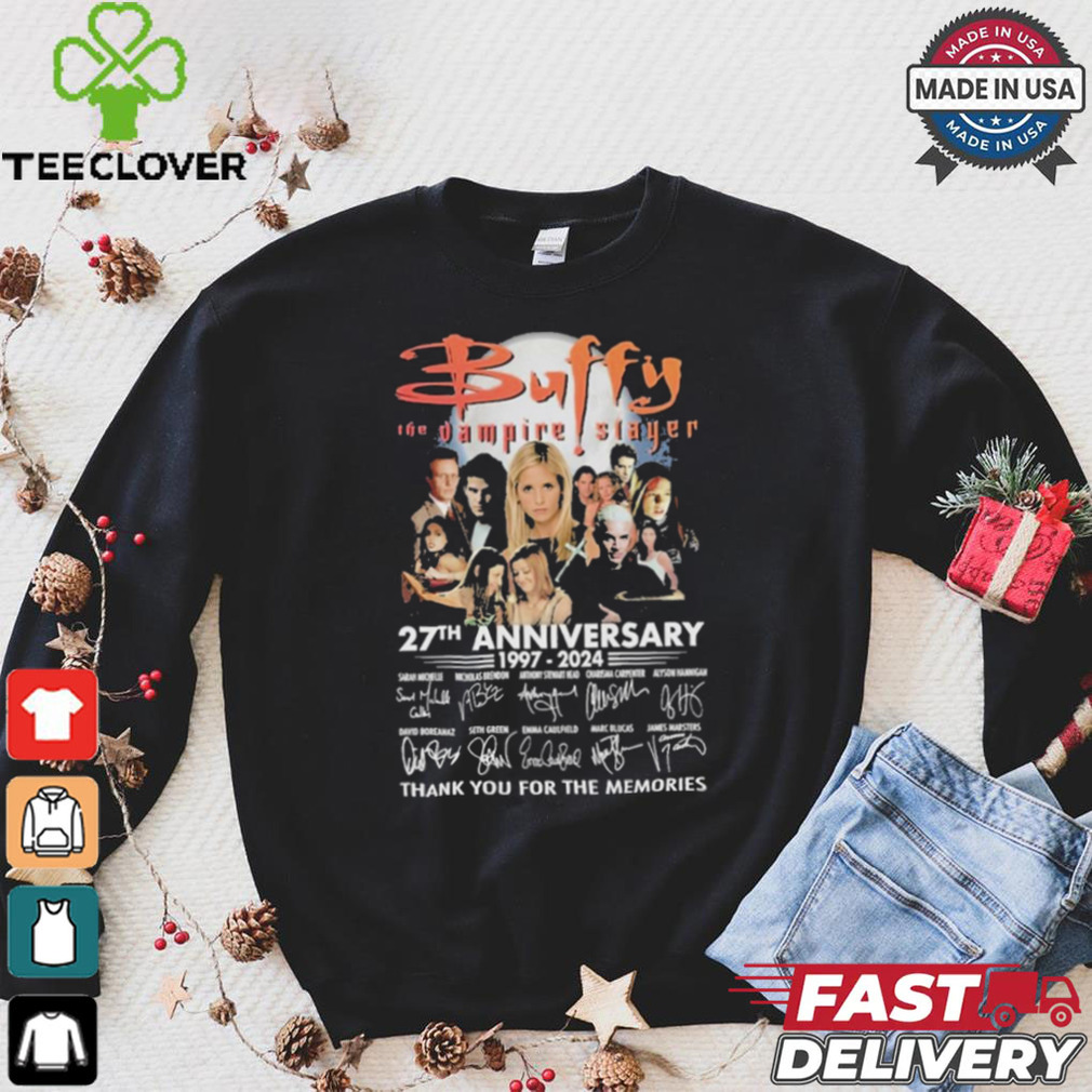Geography. Pick the local team. If you are in say Miami, congratulations you can be a Dolphins fan and if you want to support teams across several levels, then the Dolphins for the NFL, Miami Hurricane among the power college programs and Florida International Panthers in the so-called Group of 5. If you are in an area not near an NFL team pick a Buffy The Vampire Slayer 27th Anniversary Signature Thank You For The Memories T Shirt college and could even find enjoyment following a small regional team that plays in Division II or III or Division I FCS. Aesthetic reasons. You like the dark blue and orange combo of the Denver Broncos then that can be your team (also opens up the Boise State Broncos in college football). Iβm a Denver Broncos fan and Kansas City is a Buffy The Vampire Slayer 27th Anniversary Signature Thank You For The Memories T ShirtΒ rival but I have to admit I like their home uniform. Like red and black? That gives you the Atlanta Falcons in the NFL, Texas Tech and Arkansas State and Cincinnati just off the top of my head. I donβt like the University of Texas but I happen to think their road uniform is one of the best in college football.