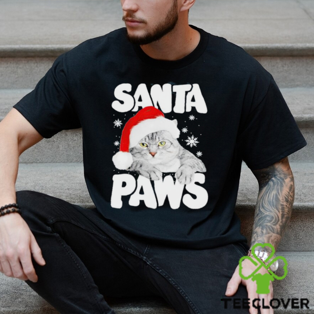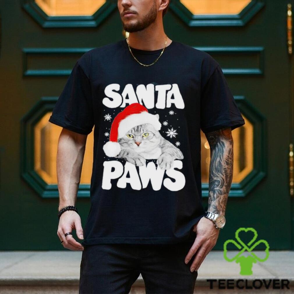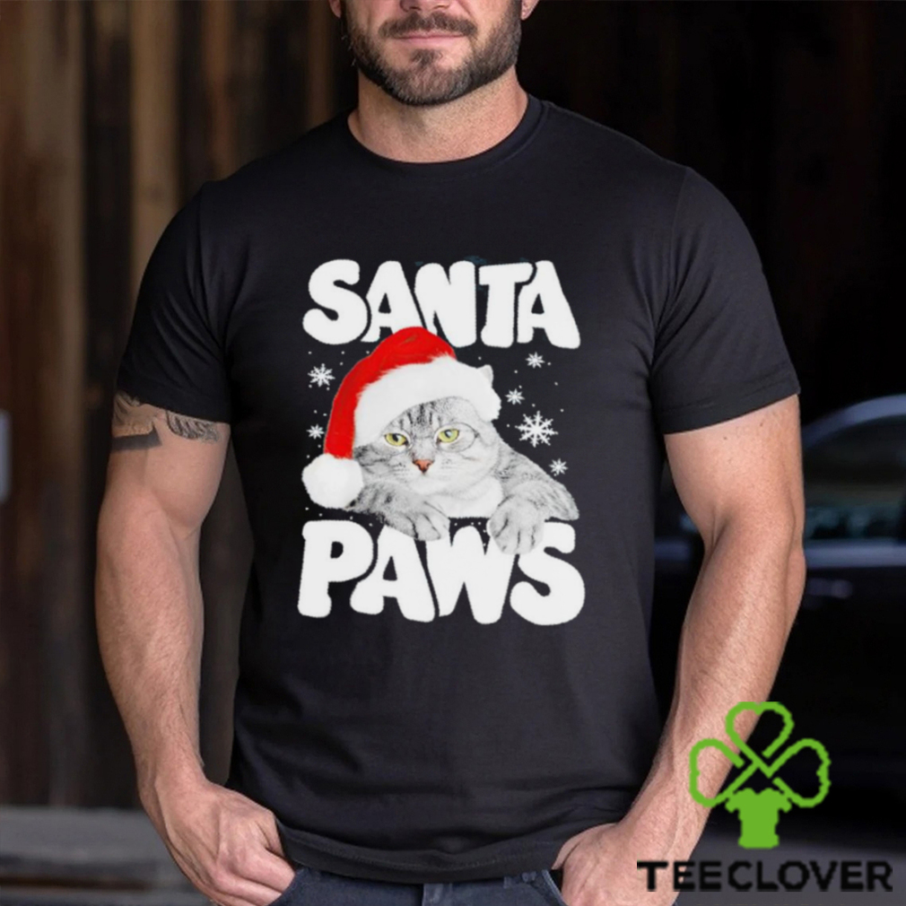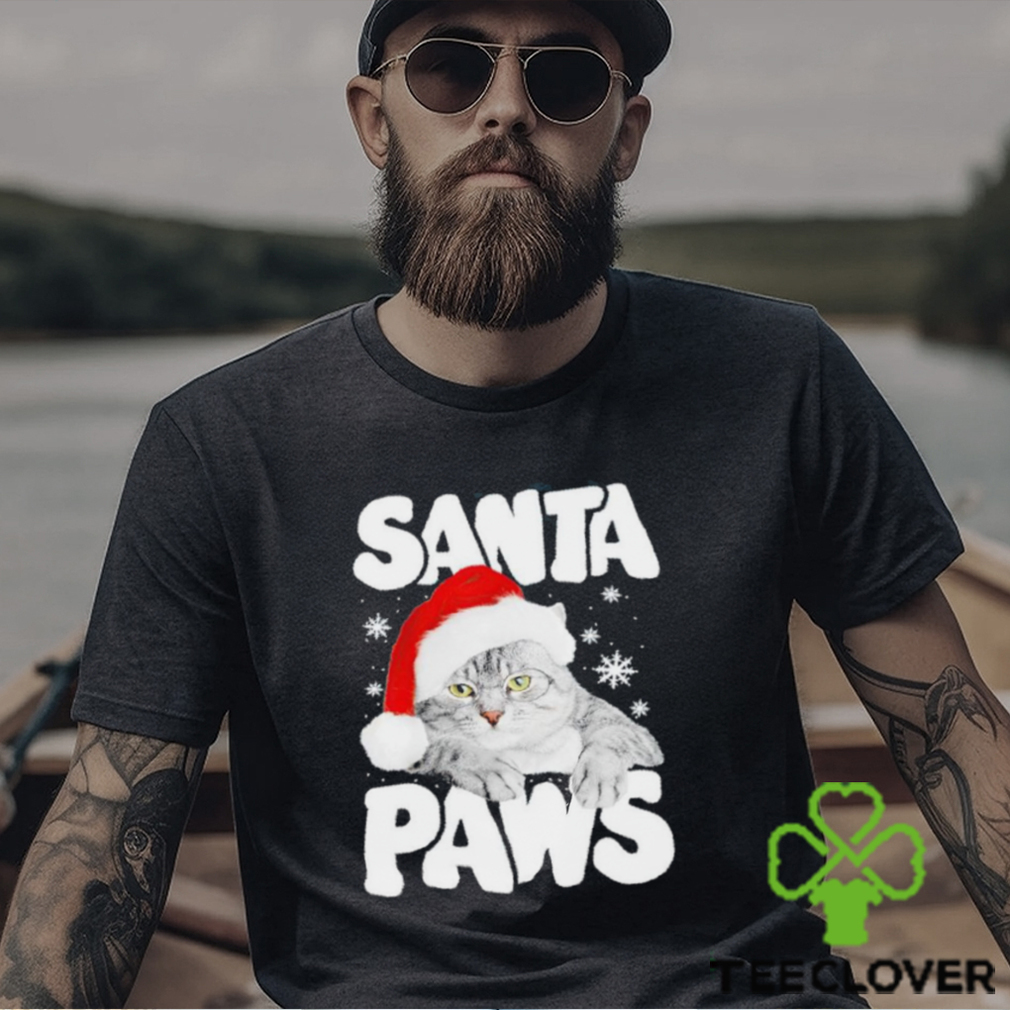 Many of the Cat hat santa santa paws merry christmas shirt Christmas customs were inherited from older Winter Solstice celebrationsโincluding greenery indoors, feasting and gift-giving. It seems quite likely that the celebration of the birth of Jesus was scheduled at that time in order to piggy-back on existing holiday observances. Halloween is very directly descended from the old Celtic feast of Samhain, when the dead return to visit the living. Modern Pagans observe this and Beltane (May Day) as their major holidays, the Feast of the Dead and the Feast of the Living on opposite sides of the Wheel of the Year. Easterโs Pagan connections are suggested by its English name, Eostara being a Pagan Germanic Goddess associated with the Spring Equinox. The bunnies and eggs probably go back to Pagan times as well.