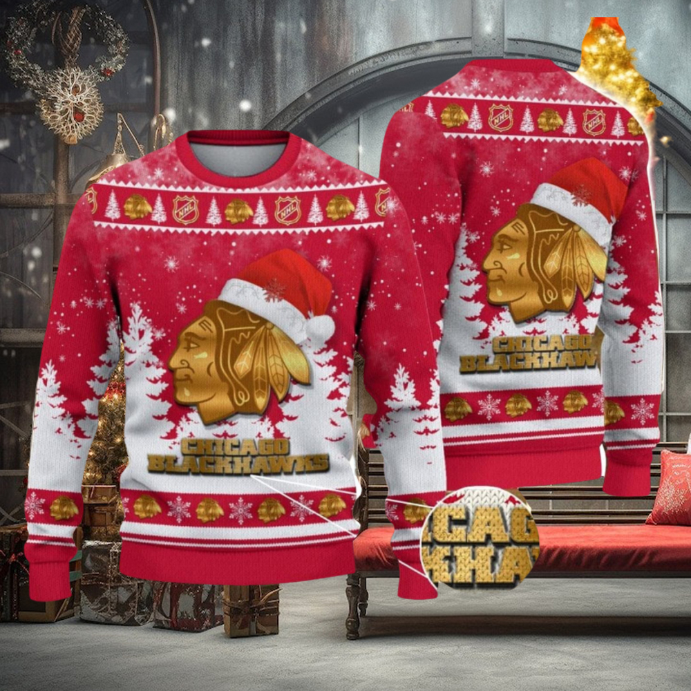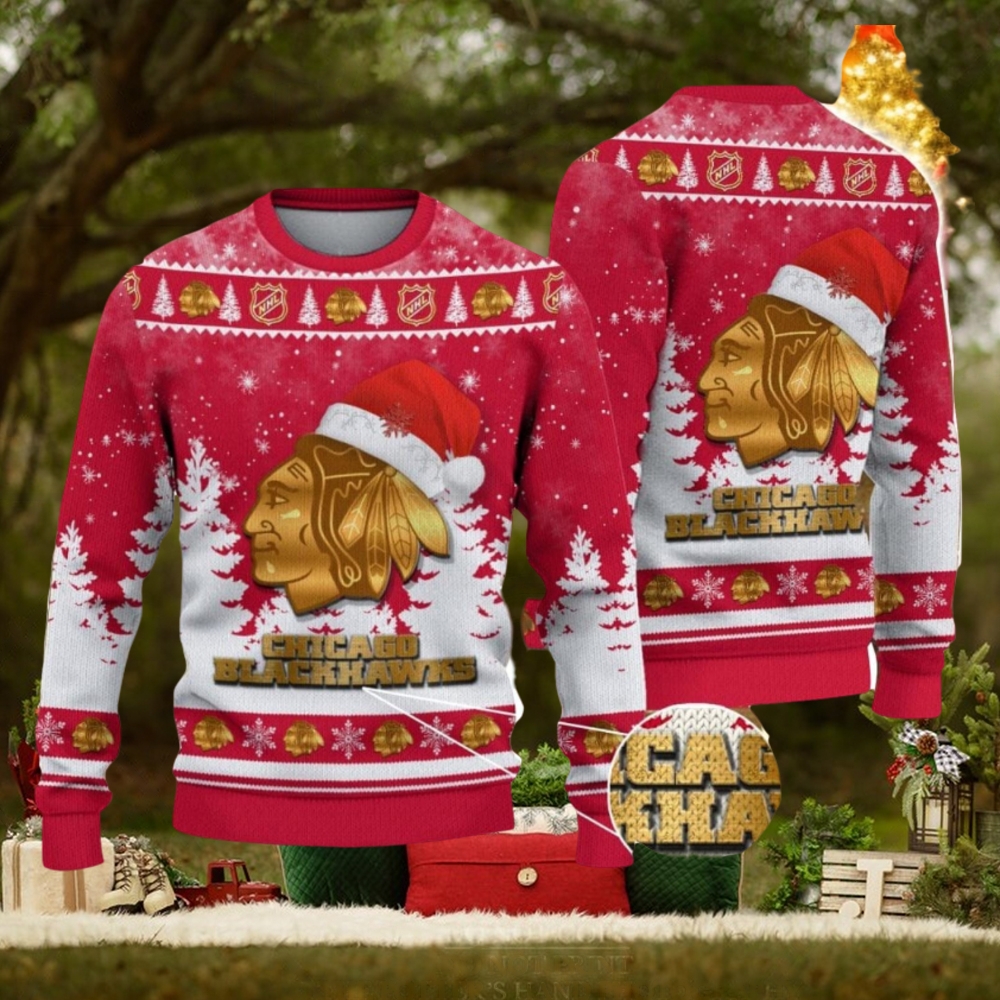 The level of specialisation in NFL would be a challenge. Each side has unlimited substitutions and has a complete offense and defense team plus special teams for kick plays. For many NFL players, there is no requirement to be able to pass, only catch β and the ball is quite a different shape. For others, there is little requirement to touch the ball at all. All of the players on a Chicago Blackhawks Logo Wearing Santa Hat Christmas Gift Ugly Christmas Sweater For Sport Fans team need to be able to pass and catch. Kickers are specialised roles in NFL, whilst in Rugby, 3 of the positions require excellent kicking (scrum half, fly half, full back) and in the other βbacks’ positions (inside and outside centres and two wingers), most teams have at least 2 additional accomplished at kicking from hand in open play.