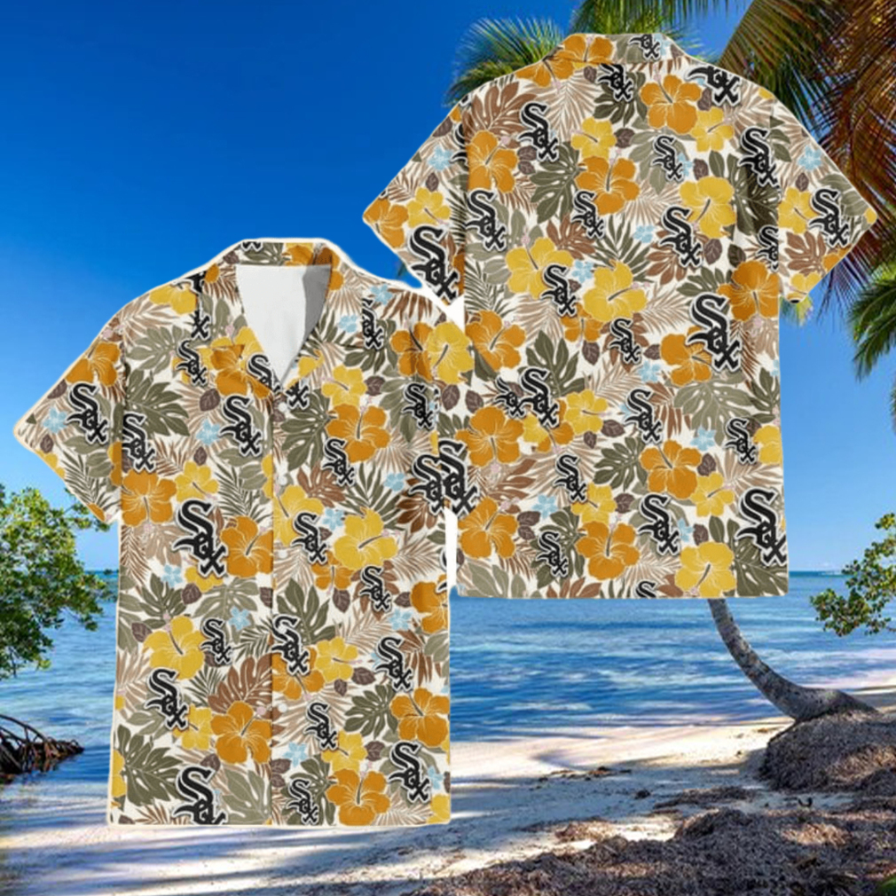 Chicago White Sox Brown Yellow Hibiscus White Background 3D Hawaiian Shirt Gift For Fans
