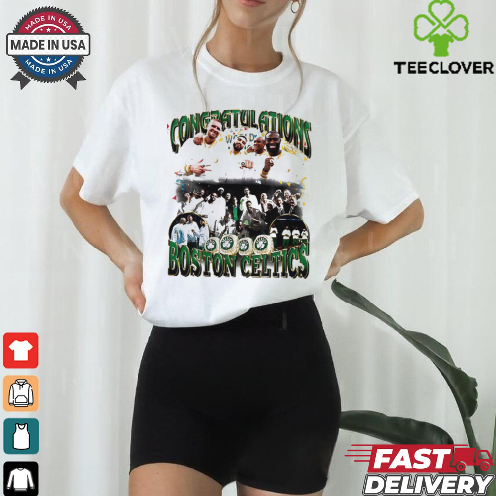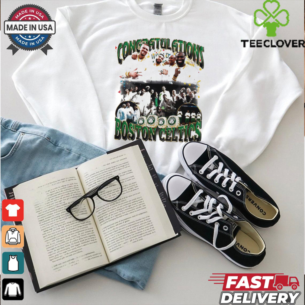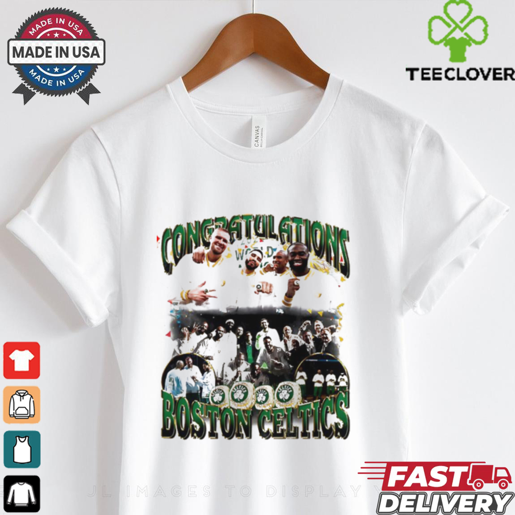 If you choose to wash your bras in the Congratulations Boston Celtics 18th Ring Champions shirt machine, be sure to wash them in mesh bags to prevent the cups from getting crushed in the wash. To dry your bras, simply lay them flat to dry with the cups facing up or hang them to dry or drape them over a hanger so the center gore lies on the hanger.To buy a proper bra for yourself you first need to know the size of your breasts, for this get hold of a measuring tape, a pen/pencil and a piece of paper. Now measure the circumference of your body just beneath your breasts and note it down, this size is your band size. Take another measurement around the fullest part of your breasts(refer to the picture below), this is required for calculating your cup size.