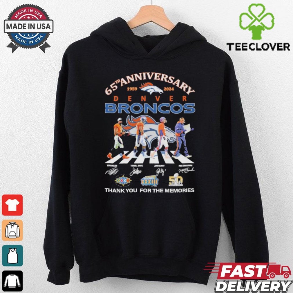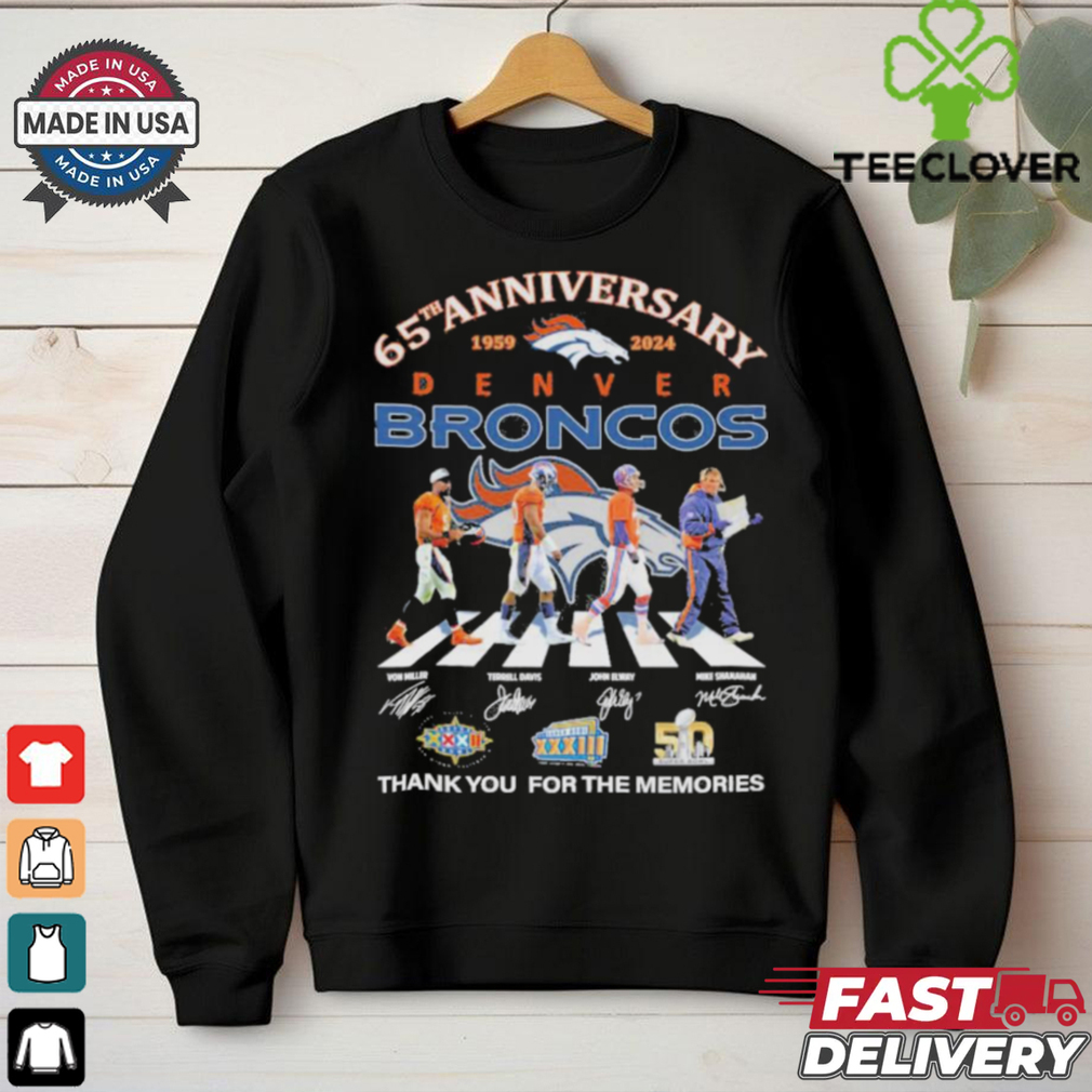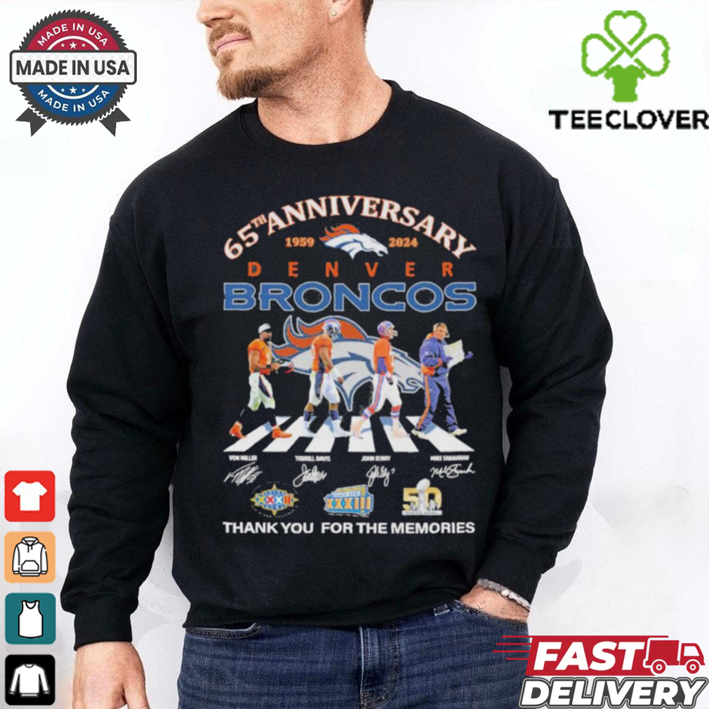 ()Denver Broncos 65th Anniversary 1959 2024 Legend Von Miller Terrell Davis John Elway And Mike Shanahan Signatures Shirt hoodie, tank top, sweater and long sleeve t-shirt: best style for you