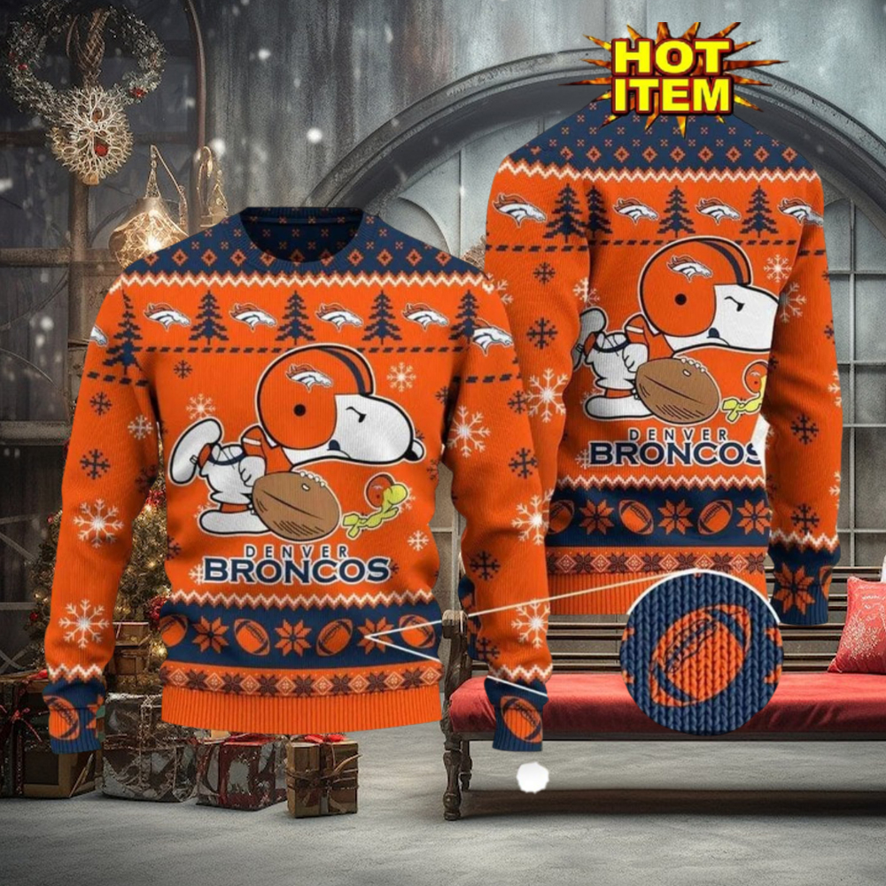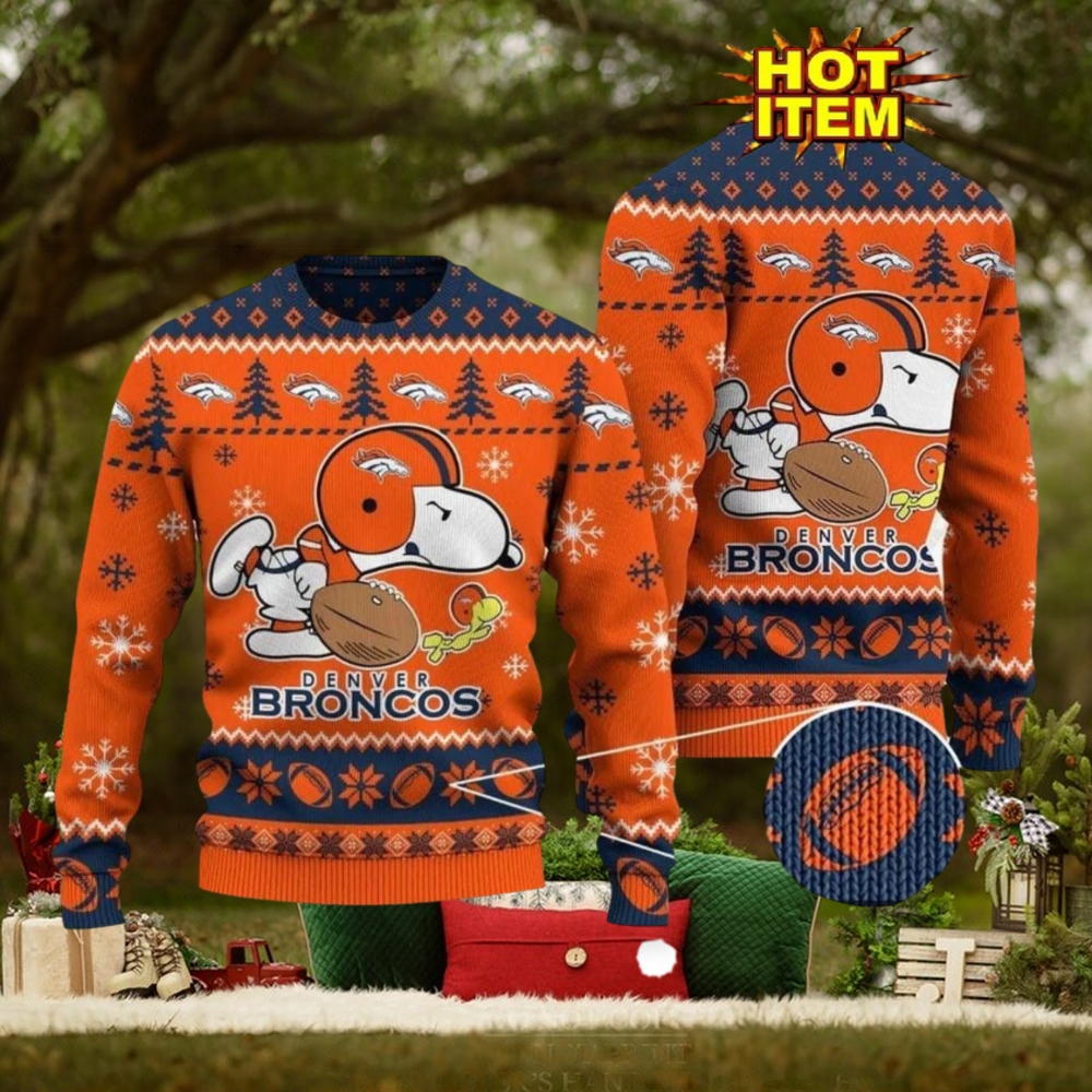 The level of specialisation in NFL would be a challenge. Each side has unlimited substitutions and has a complete offense and defense team plus special teams for kick plays. For many NFL players, there is no requirement to be able to pass, only catch β and the ball is quite a different shape. For others, there is little requirement to touch the ball at all. All of the players on a Denver Broncos Logos American Football Snoopy Dog Ugly Christmas Sweater Funny Christmas Gift For Sport Fans team need to be able to pass and catch. Kickers are specialised roles in NFL, whilst in Rugby, 3 of the positions require excellent kicking (scrum half, fly half, full back) and in the other βbacks’ positions (inside and outside centres and two wingers), most teams have at least 2 additional accomplished at kicking from hand in open play.