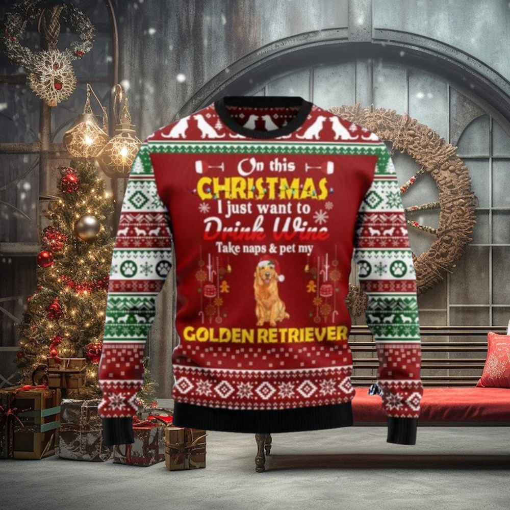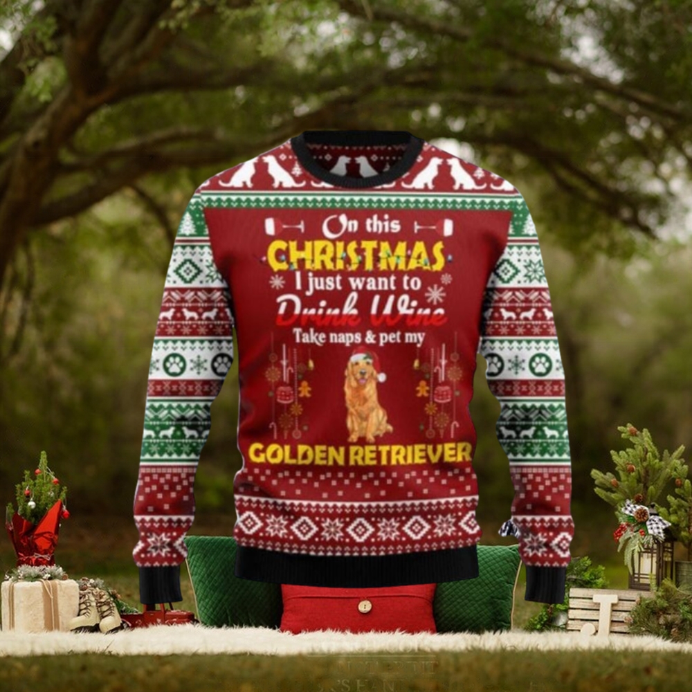 ()Drink Wine Pet My Golden Retriever Ugly Christmas Sweaters 3D,