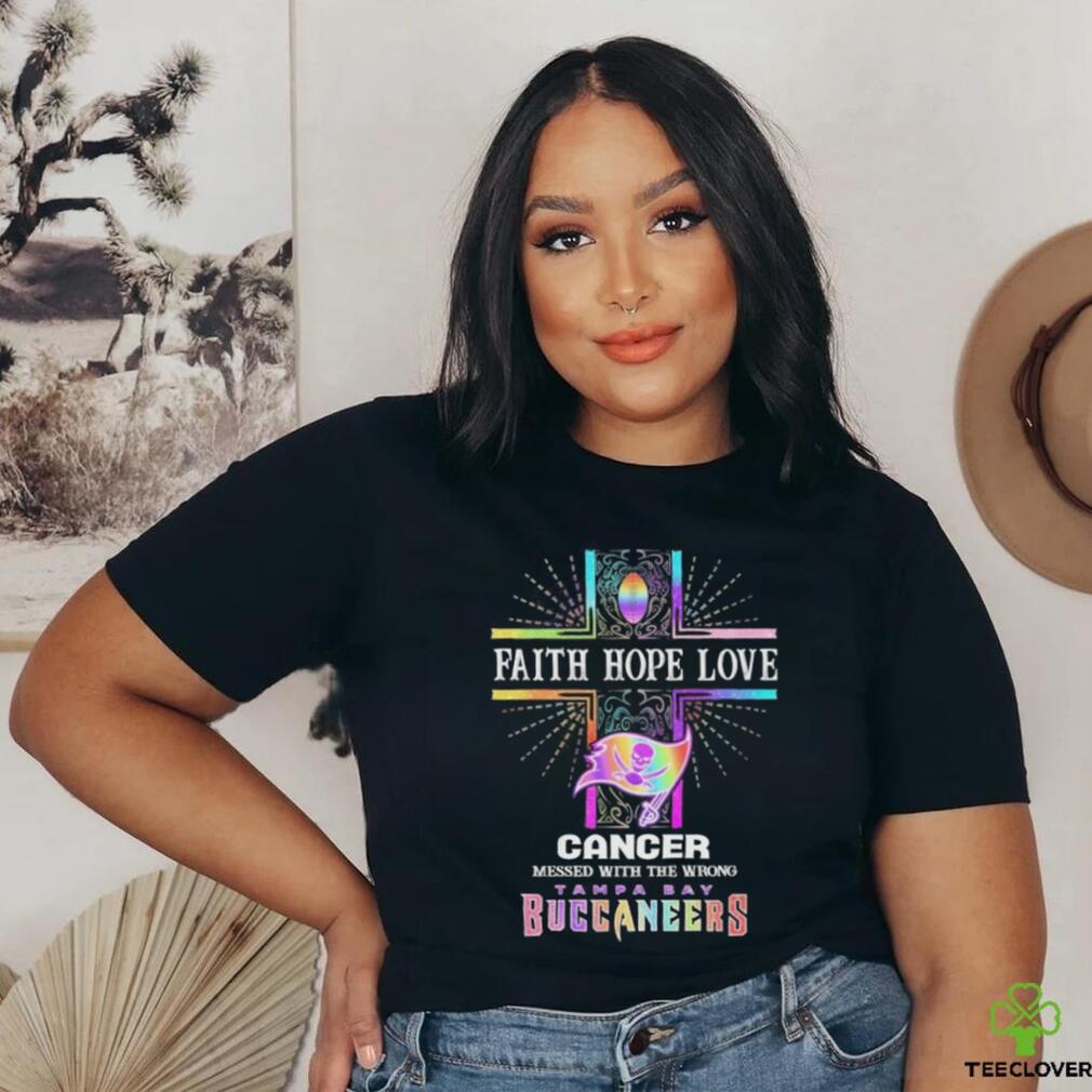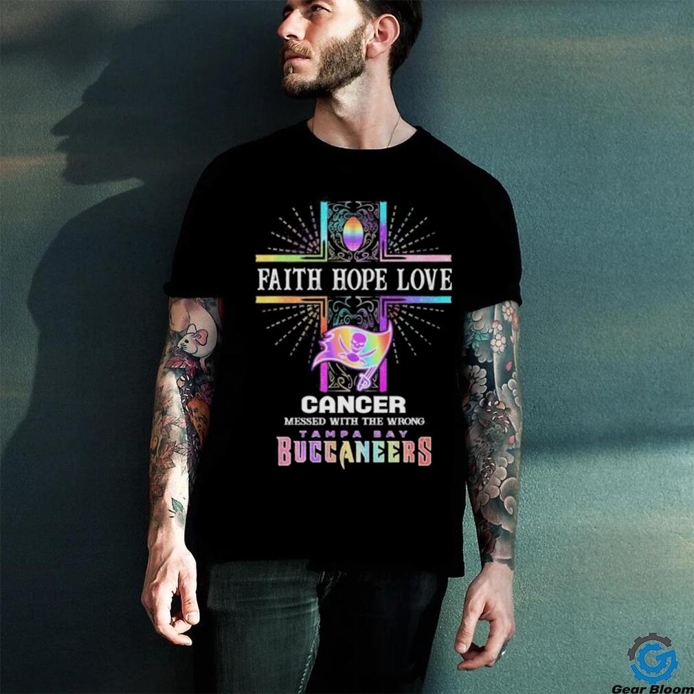Best Faith Hope Love Cancer Messed With The Wrong Tampa Bay Buccaneers Pride Shirt