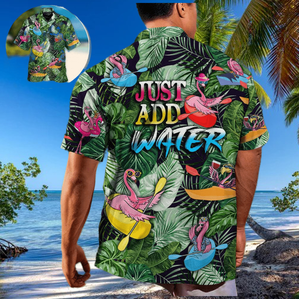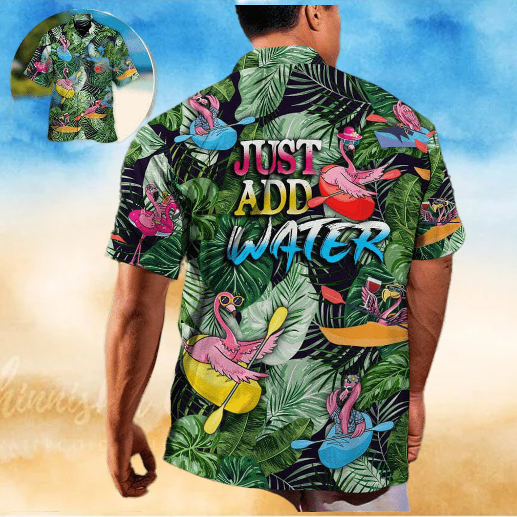 Best Funny Flamingo Playing Kayaking Just Add Water Palm Leaves Pattern Hawaiian Shirt
