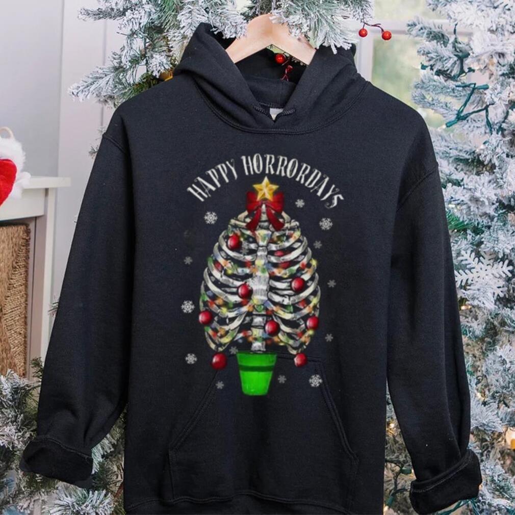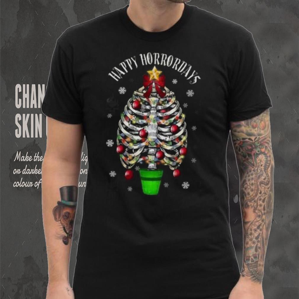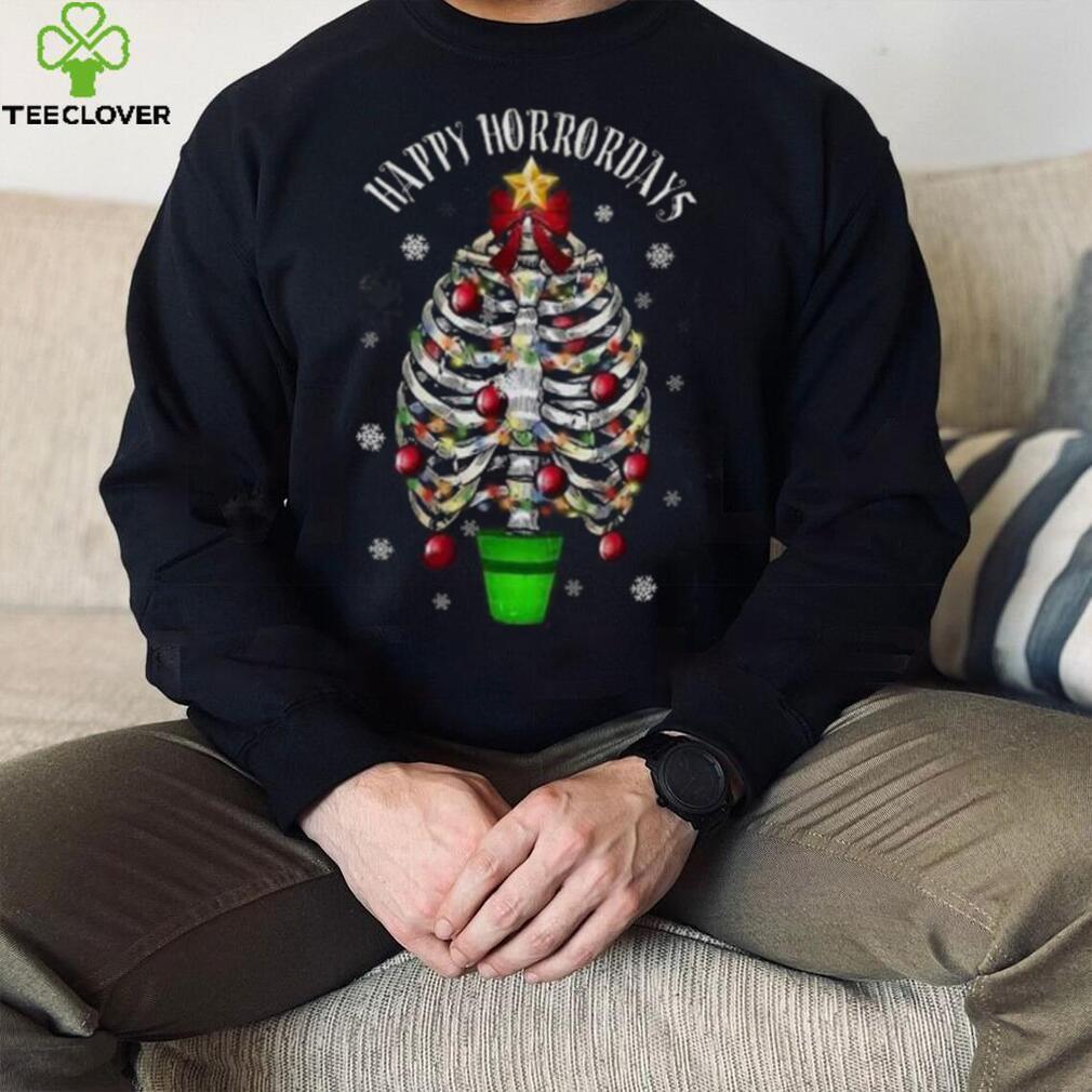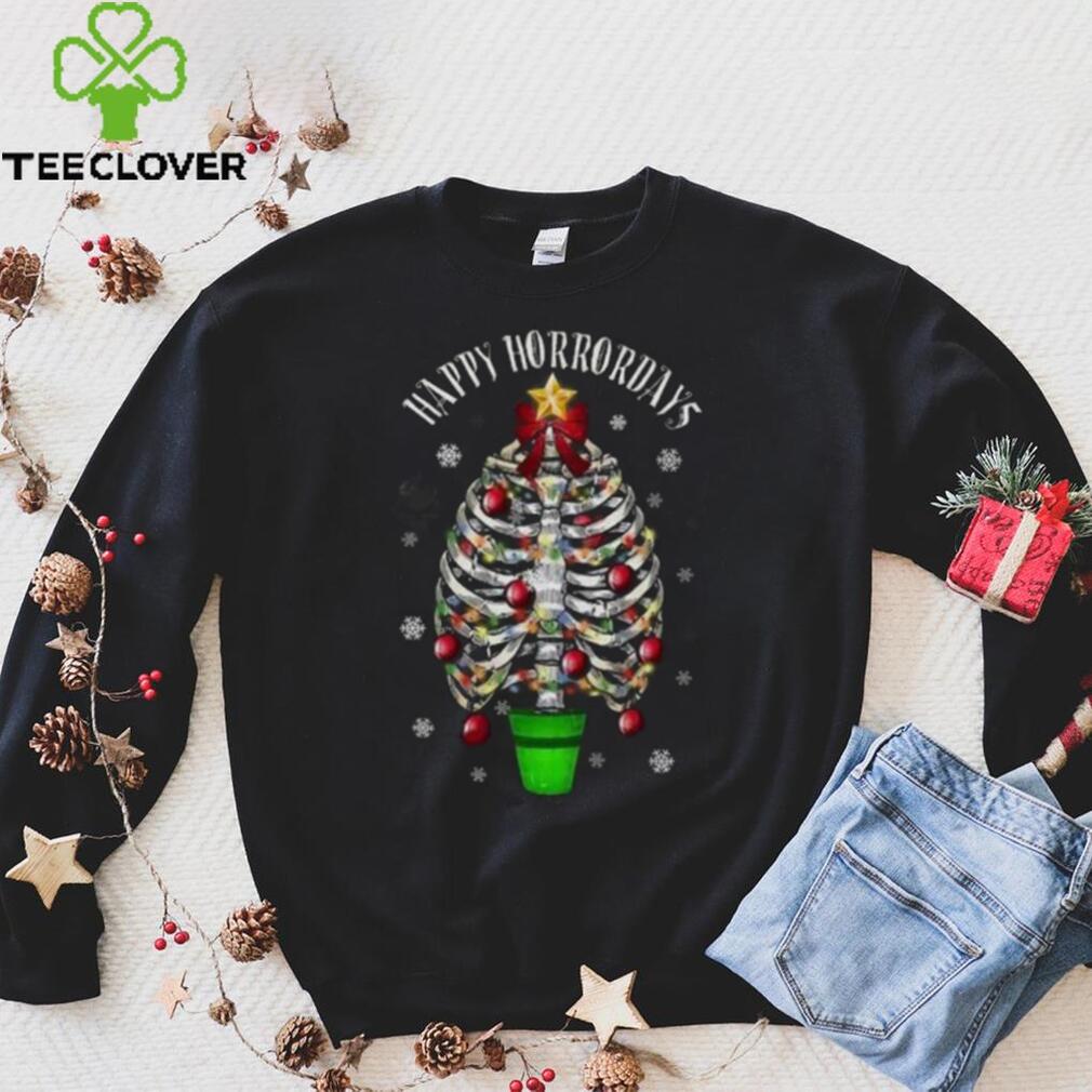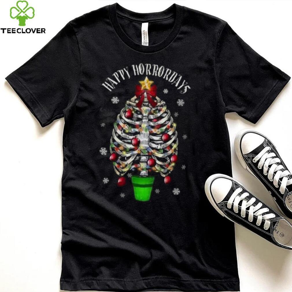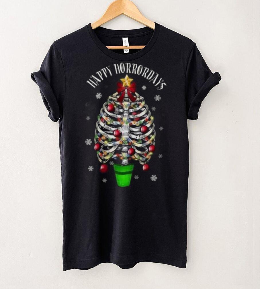 I do not remember Christmas Day itself that year, but the events around theHappy Horror Days Tree Horror Skeleton Christmas T Shirt Womens this holiday changed my life forever. I was living in Los Angles at the time and was dirt poor as I was very underemployed. I did not have any ambition, but was content. I had a new girl friend (we had been dating for not yet six weeks). I was too poor to buy a Christmas tree. It had been raining for about a week, and was expected to raining for the next week (for those of you that do not know the weather for Los Angeles, this was highly unusual). Three days before Christmas I was driving around with my girlfriend doing some last minute Christmas shopping, when an announcement came on the radio that they were giving away free Christmas trees at a location about one half mile from where we were. I looked at my girlfriend and she said, βYes, letβs go get a Christmas treeβ A couple left turns later, there we were. There was a truck with two trailers full of Christmas trees trying to give them away. The owner of the property where the truck was park had call the police and wanted them to be charged with trespassing. He had Christmas tree lot down the street and this was killing his business.