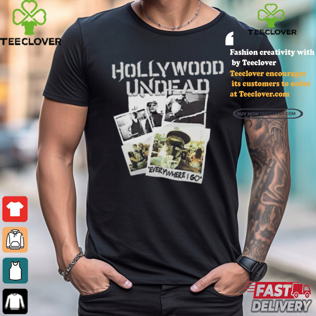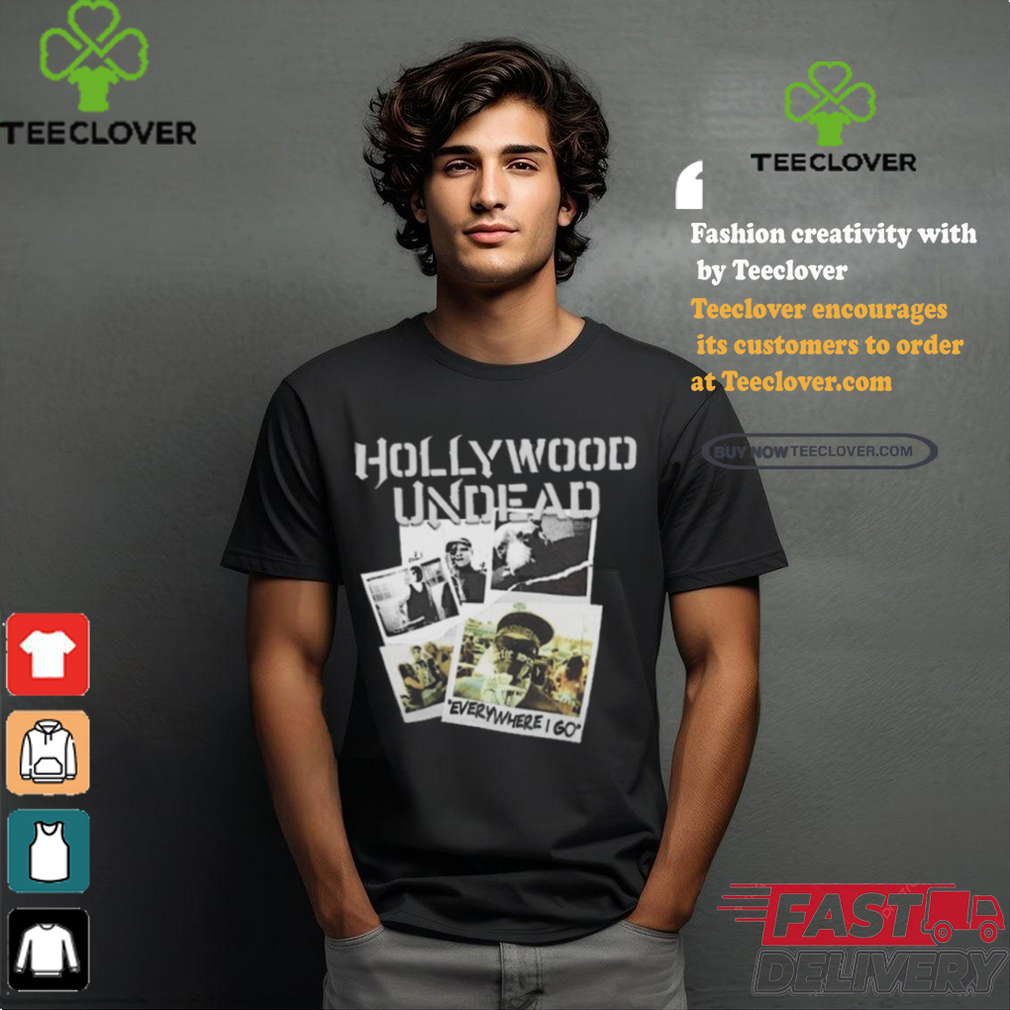 One morning I was in the kitchen, Hollywood Undead Everywhere I Go Art Prints 2024 Shirt ready to leave for work, when I heard a clattering noise in the front hall. I ignored it, but it got louder. I went to investigate and saw my cat Little Bit had dragged my mp3 player and earbuds to the stairs and was pushing them down. She pushed them the rest of the way down so they were at my feet and then she sat and looked up at me. I normally take them with me every morning, but had forgotten them on my dresser that day.