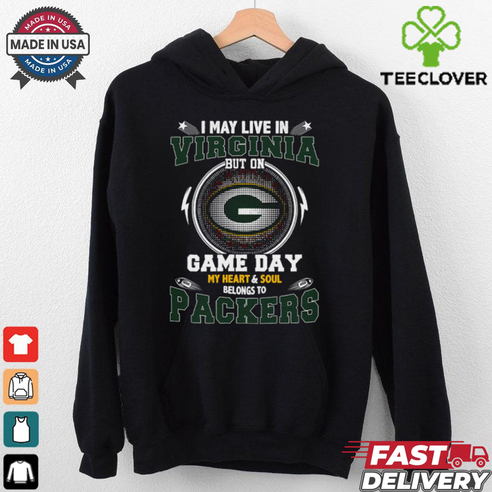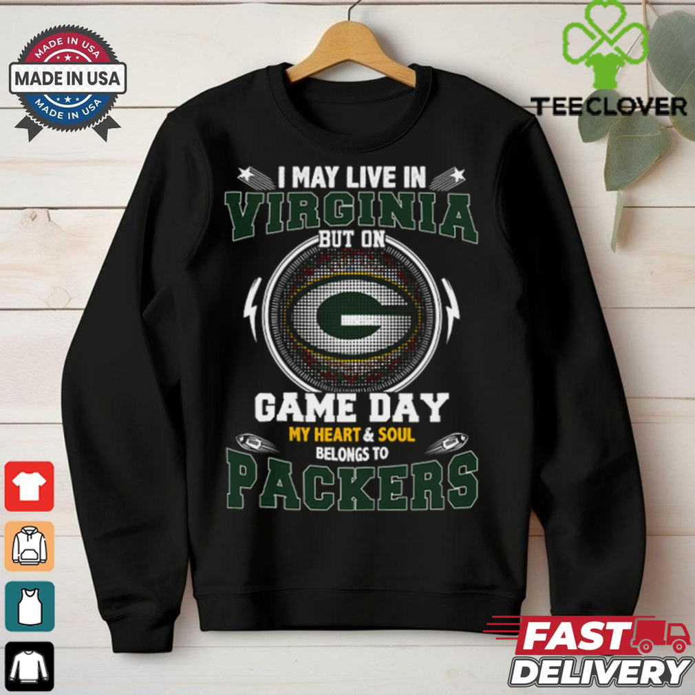 ()I May Live In Virginia But On Game Day My Heart & Soul Belongs To Green Bay Packers T Shirt hoodie, tank top, sweater and long sleeve t-shirt: best style for you