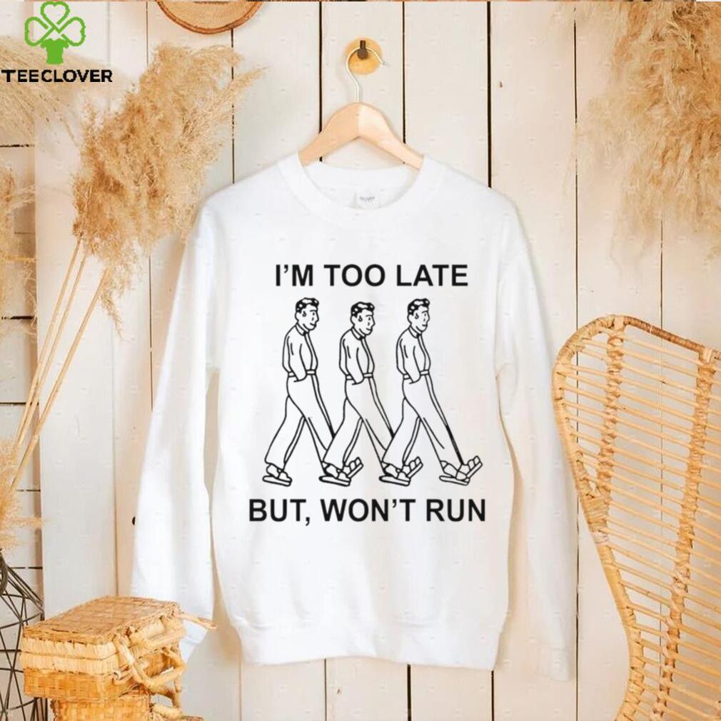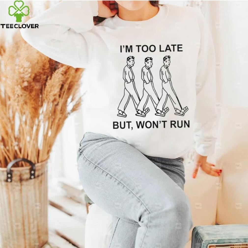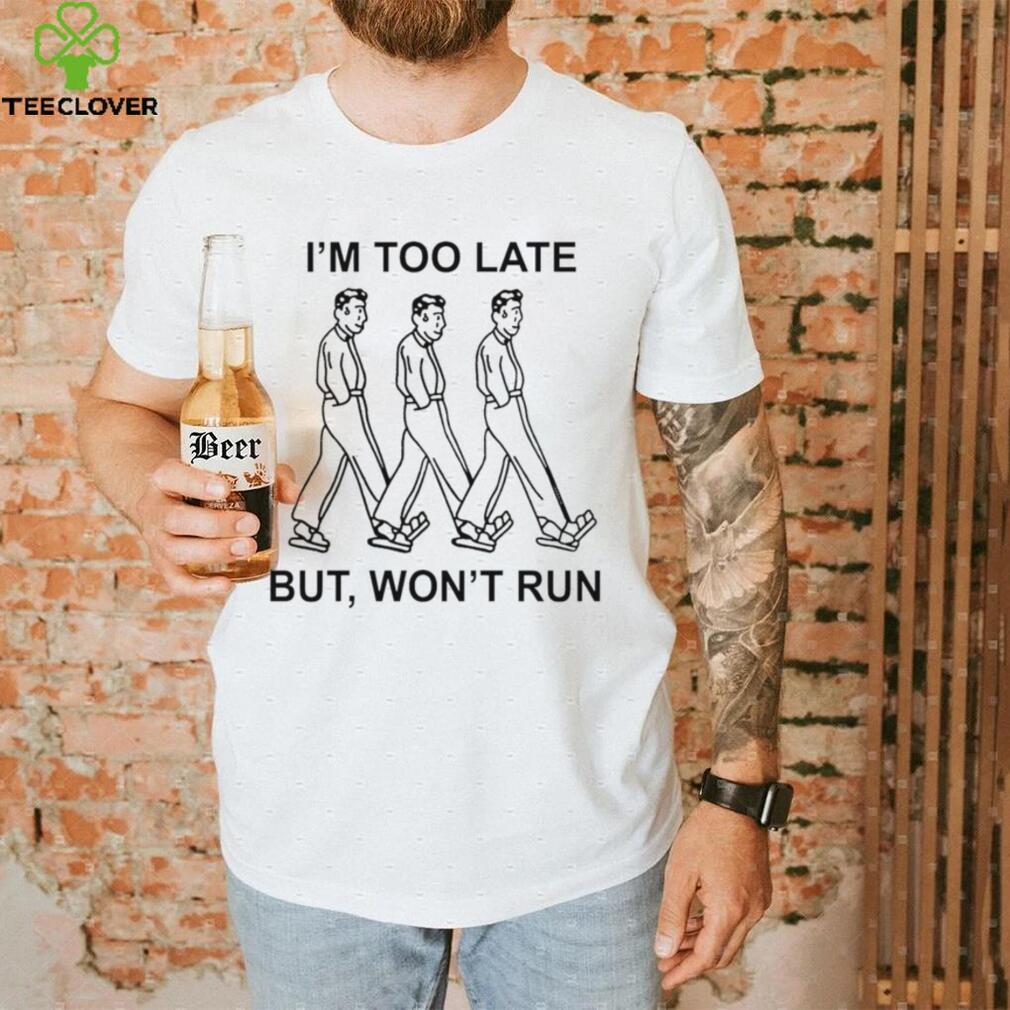 Rugby League may be the easier game to play in terms of learning how, but it has a I’m too late but won’t run shirt cardiovascular fitness requirement compared to the NFL — and higher than that of Rugby Union. An NFL game of 60 minutes takes about 3 hours to play, with multiple personel changes. Many NFL players are simply not fit enough to play either Rugby code, where the minimum fitness required is to play 40 minutes straight and a further 20 minutes after a 15 minute half time break. League is especially demanding on fitness because the ball is in play for a higher percentage of that time. From what I’ve seen, a lot of NFL players would require a year of physical conditioning to play rugby to any decent level.