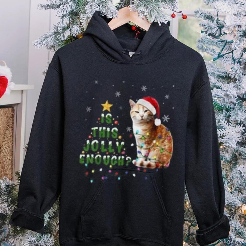 My funny story is when Santa put himself on the naughty list. I travelled the Is This Jolly Enough Santa Cat Light Christmas Shirt home from work a few years ago, and I enjoyed all the Christmas lights and decorations every night. One house had a huge blow up Santa on top of the garage, with his arm raised, waving at you when the wind blew. One day I left work early, and it was still daylight. As I turned the corner on this windy day, I saw Santa was a bit deflated. He was slightly bent over and his arm had fallen down so that his hand was between his legs, and the wind was blowing a bit, and he was gently bobbing up and down, up and down, and he seemed to be enjoying himself entirely too much! I was crying with laughter, and I can never look at Santa again without flashbacks.