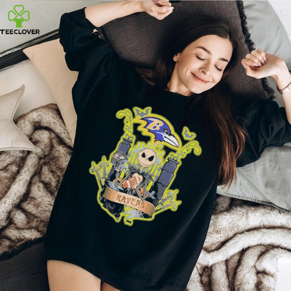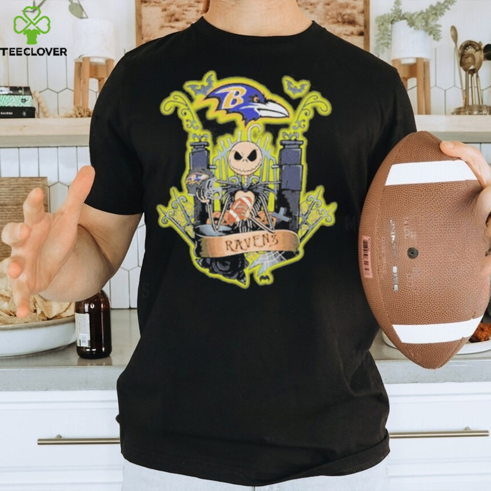 Everyone was now in good mood, including the jack skellington halloween baltimore ravens fan shirt . We had a grand time giving away tress. And we gave away thousands of trees. My girlfriend and I had just spent the last three days in a heavy rain, giving away free Christmas trees. Everyone made the best of a rainy situation. This put us both in a very good mood. I do not have any memories of Christmas day; however, two days later I asked my girlfriend if she would marry me. We had been dating all of six weeks. She said yes. We now have been married for over 45 years and often think about the βGreat Christmas Tree Caperβ around the holiday.