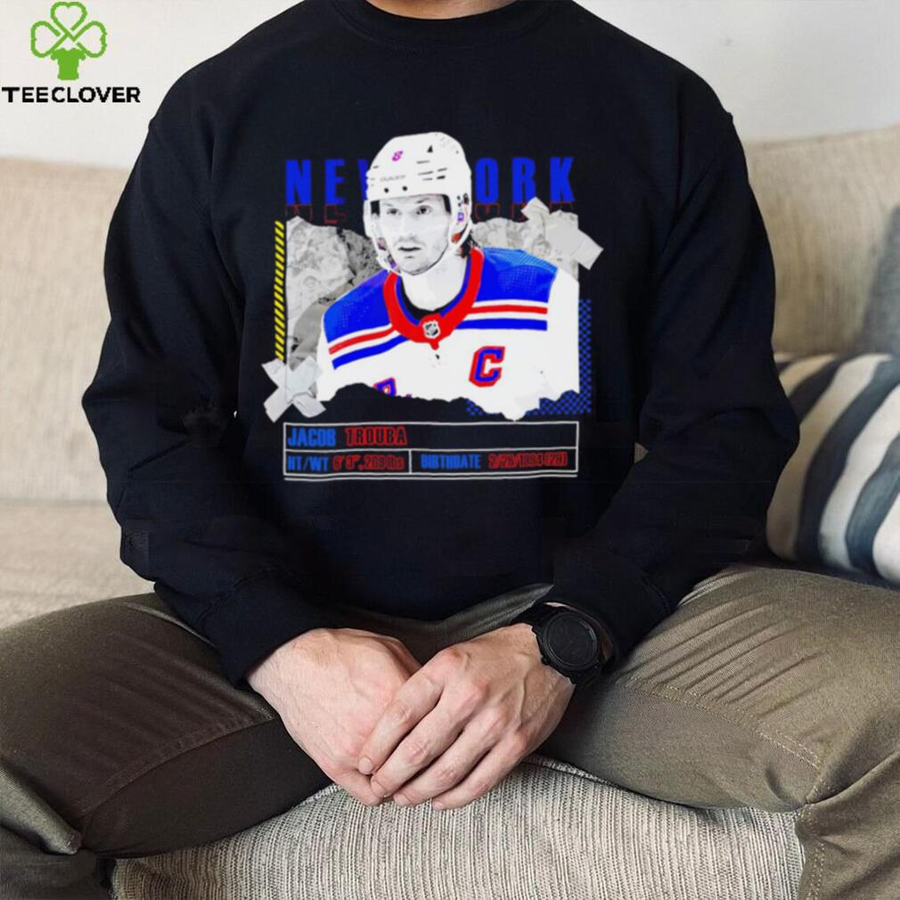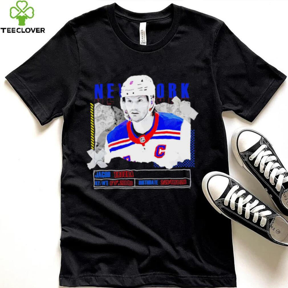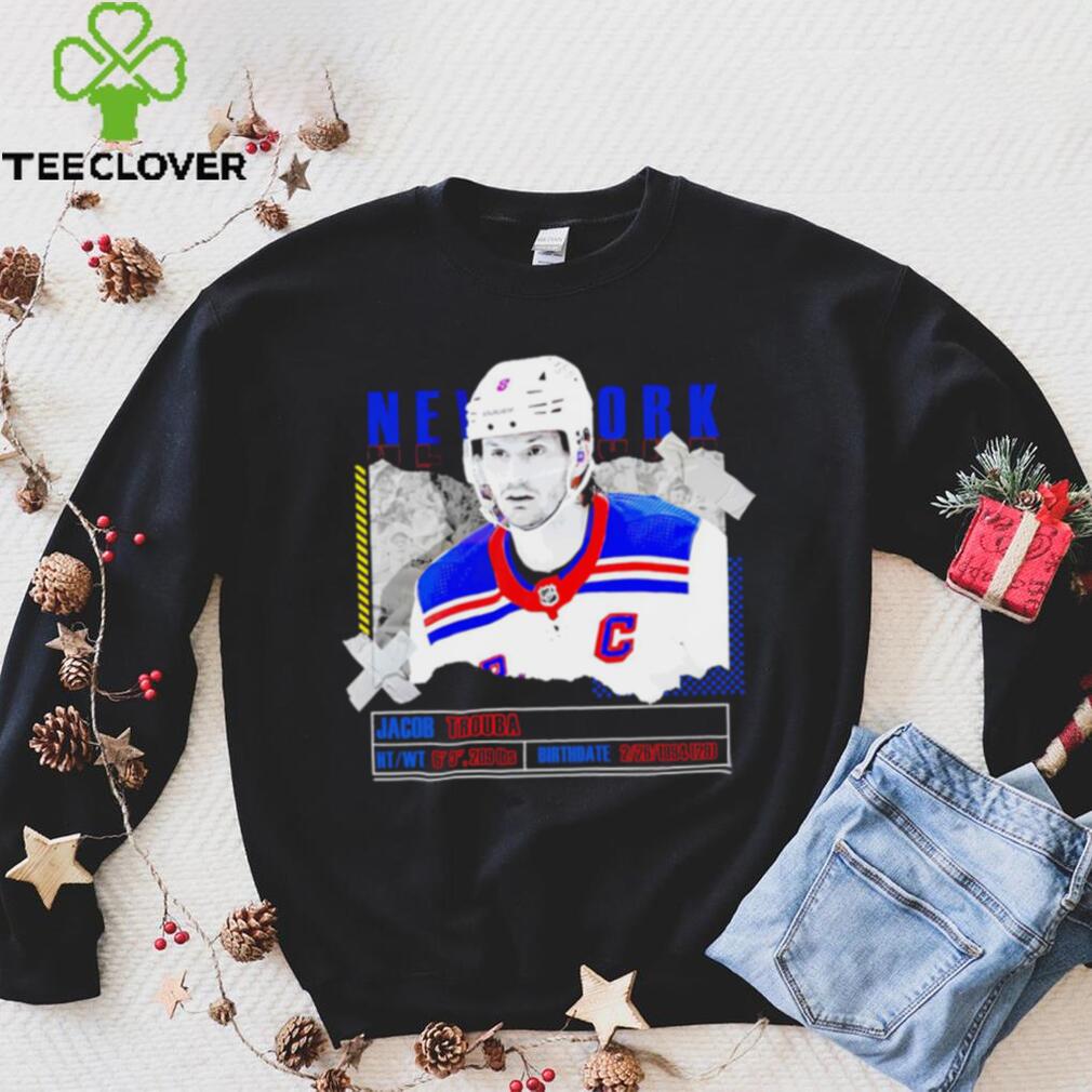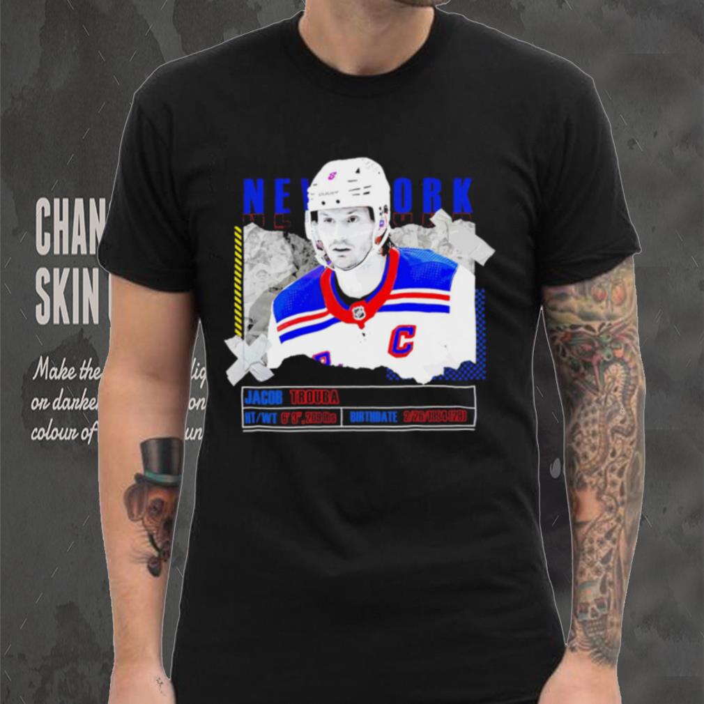 The Jacob Trouba New York Rangers ice hockey player information paper shirt to answering your question is experience. We exist to experience; we know we exist because we experience our own existence. The second key is observation. We observe our existence, our experience. We witness, record, and reflect upon our experience. The third key is intention. From observations of our experiences, we build a theory of “reality”, and make choices to act or not act based on that theory. We form an intention to create a specific experience that we want to observe. Now we have a sufficient solution to the problem. Experience, observation, and intention together create reality. They cannot exist without each other. None is more fundamental than the other, and none can be removed without destroying the others. Experience, observation, and intention: the grand experiment. We exist to try things, experience them, and observe the result. There is no meaning beyond that; when we are gone, all those things are gone too. We should use the little time we have to make as many experiments as possible. We have been blessed with the opportunity to experience, observe, and intend, and we should not waste it.