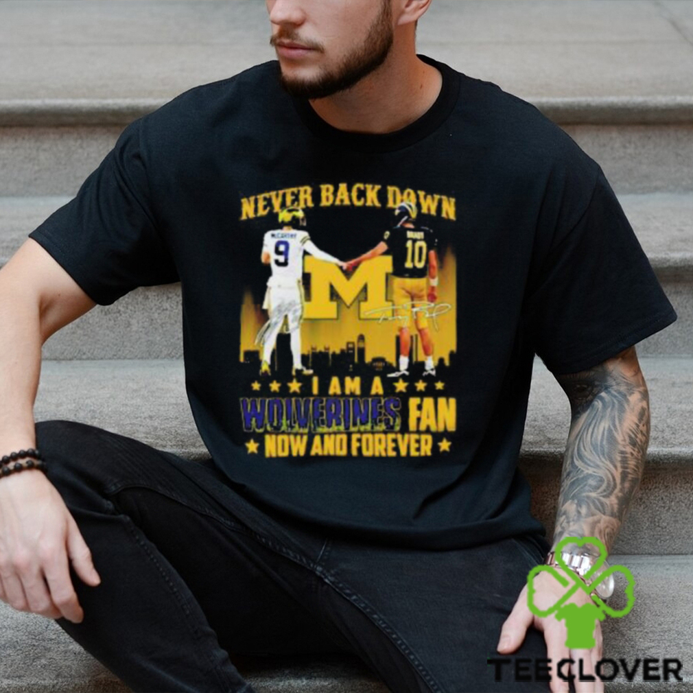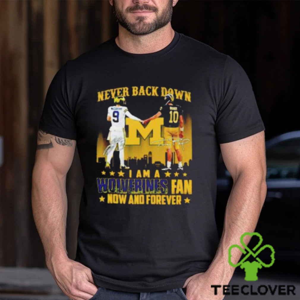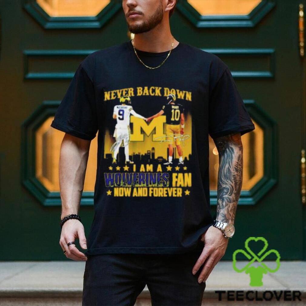 ()JJ McCarthy And Tom Brady Never Back Down I Am A Wolverines Fan Now And Forever T Shirt hoodie, tank top, sweater and long sleeve t-shirt