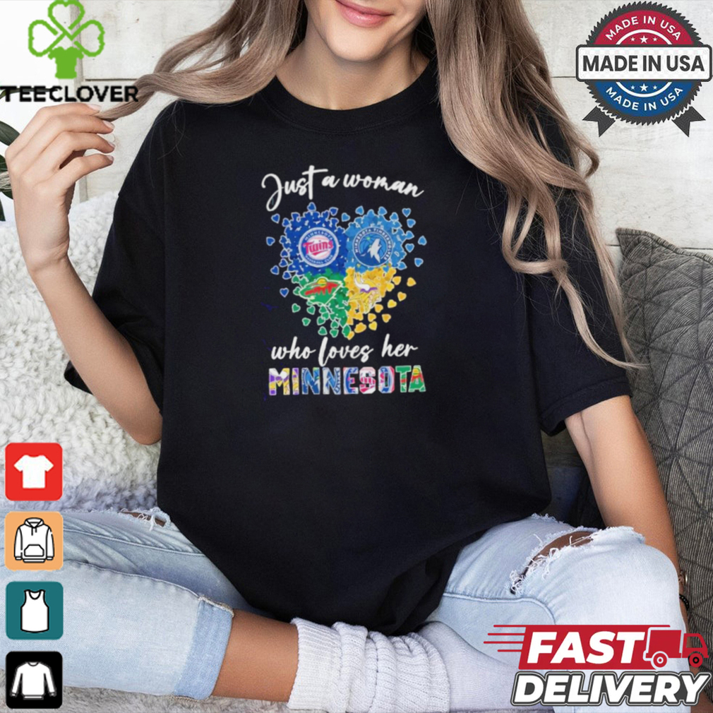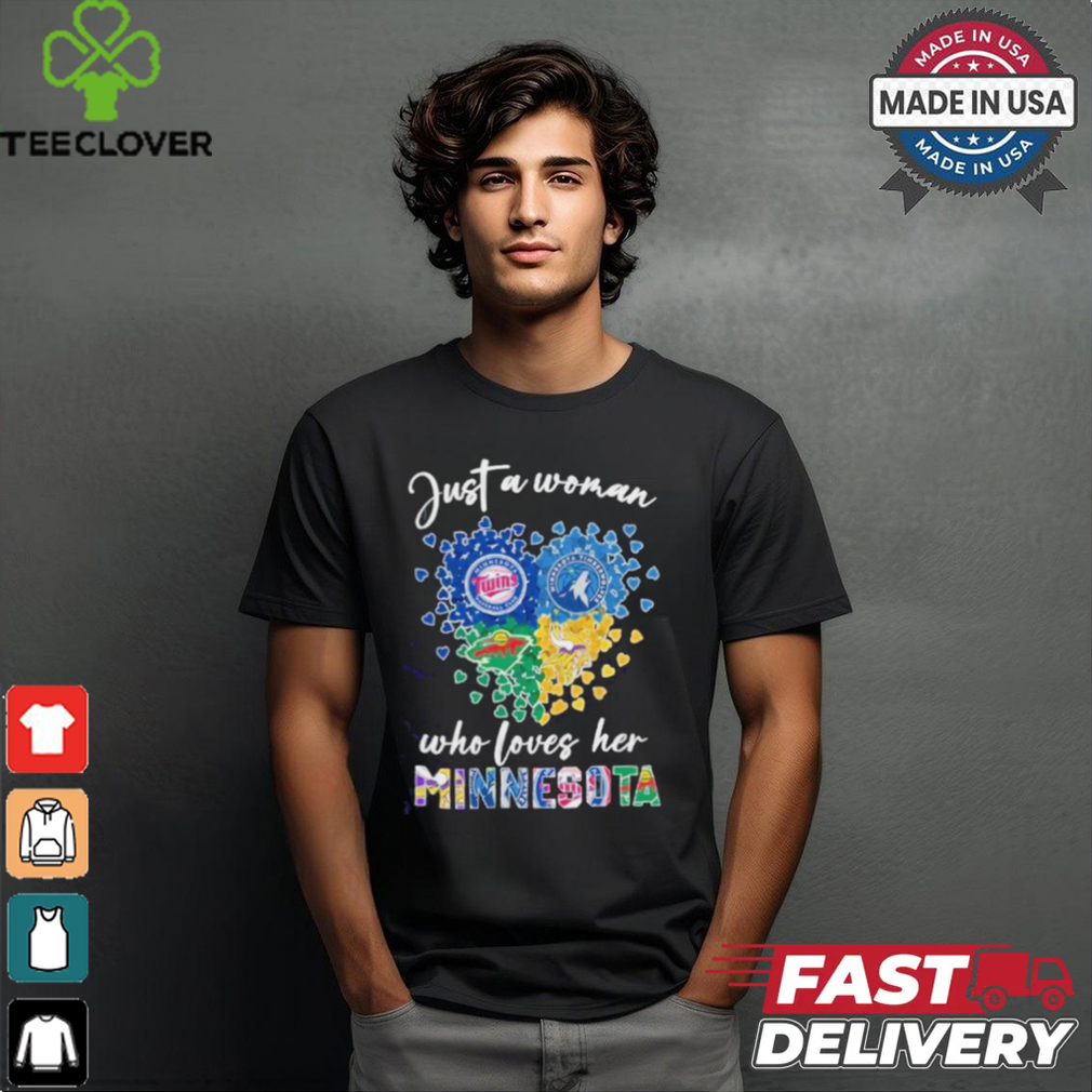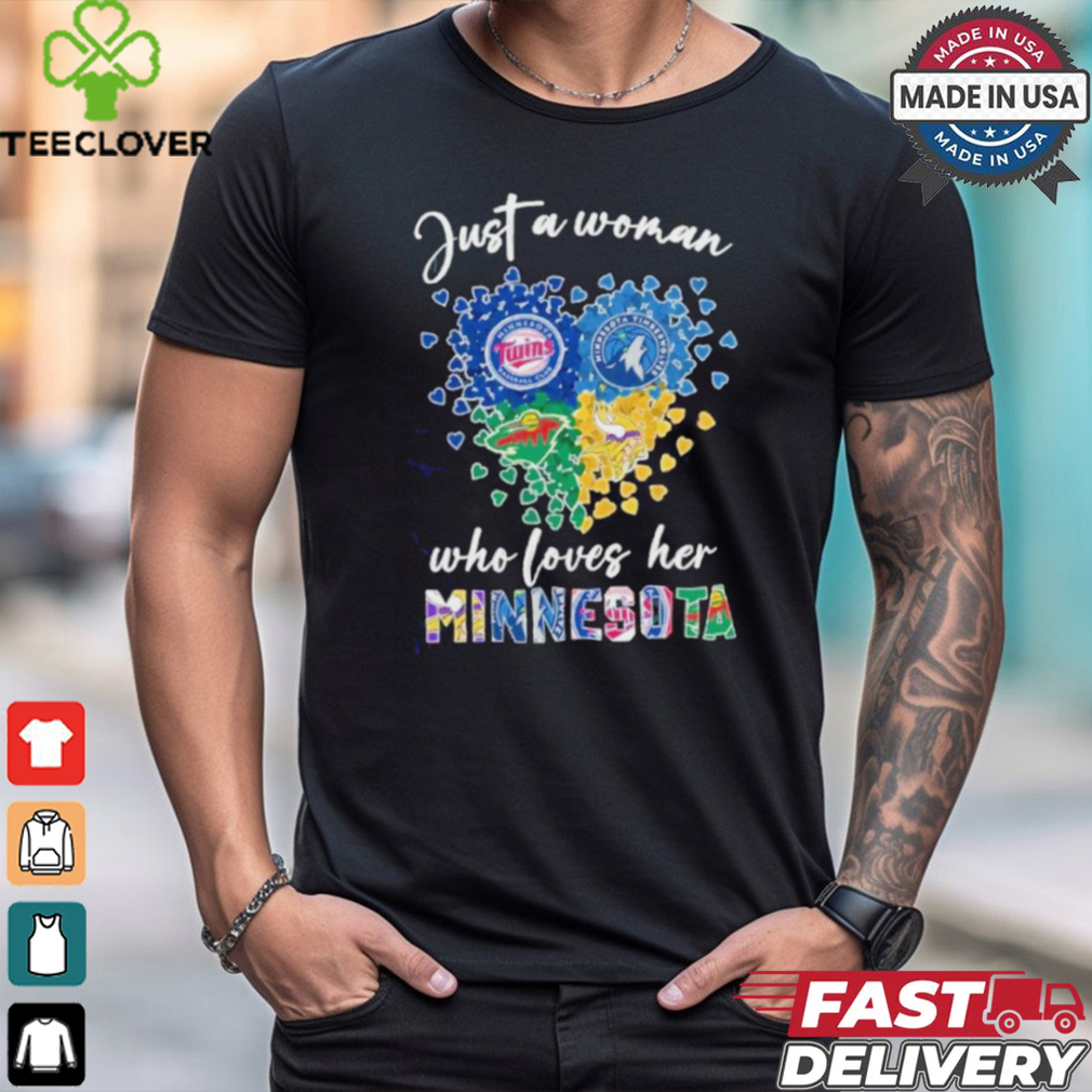 ()Just A Woman Who Loves Her Minnessota Sport Teams Logo Heart Shirt
