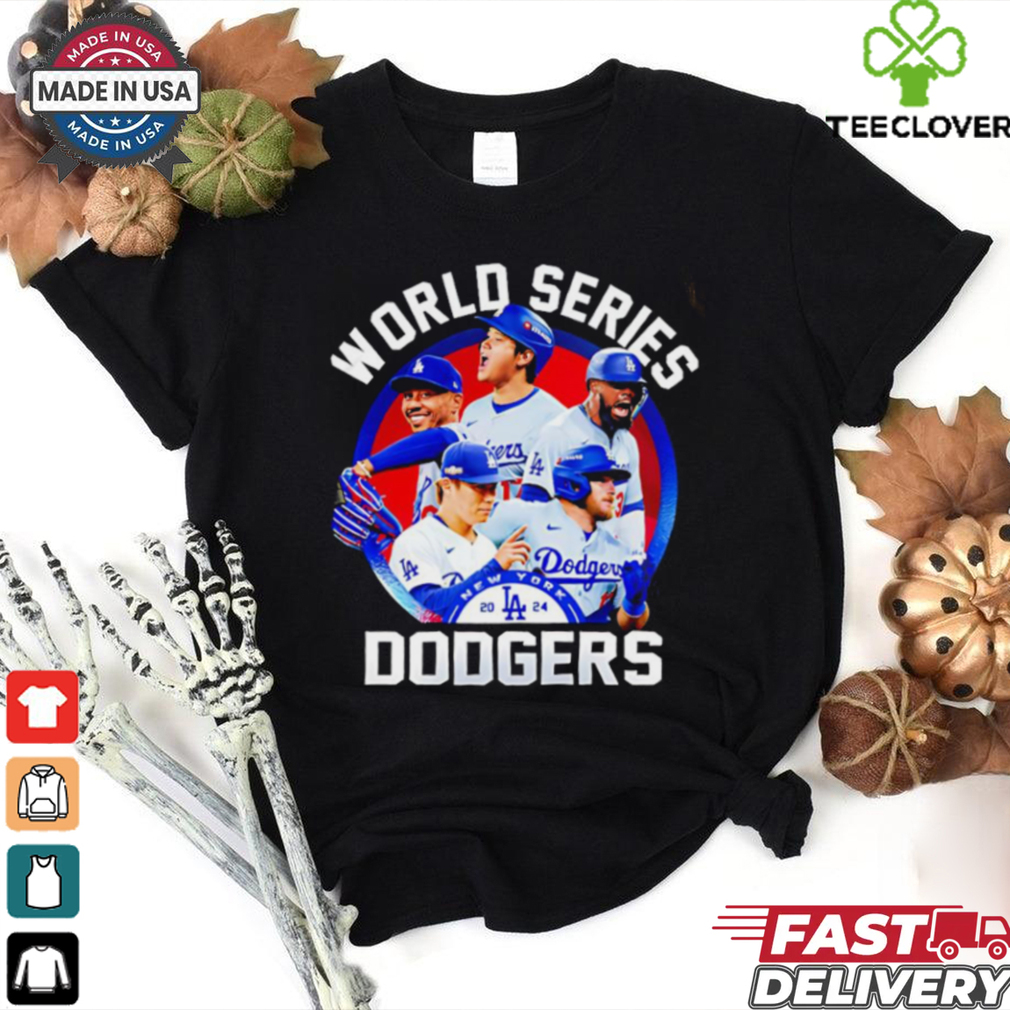 Their smooth, seamless cups look Los Angeles Dodgers LA World Series 2024 player shirt under tight-fitting clothing making them the perfect choice for fitted sweaters and bodycon dresses. Unlike unlined bras, t-shirt bras and contour bras create a symmetrical, rounded breast shape.Women with asymmetrical boobs sometimes opt for push-up t-shirt bras with removable padding so they can customize the fit for a more symmetrical look. To get the best fit, choose a t-shirt bra with a snug band and cups that completely contain your breast tissue.