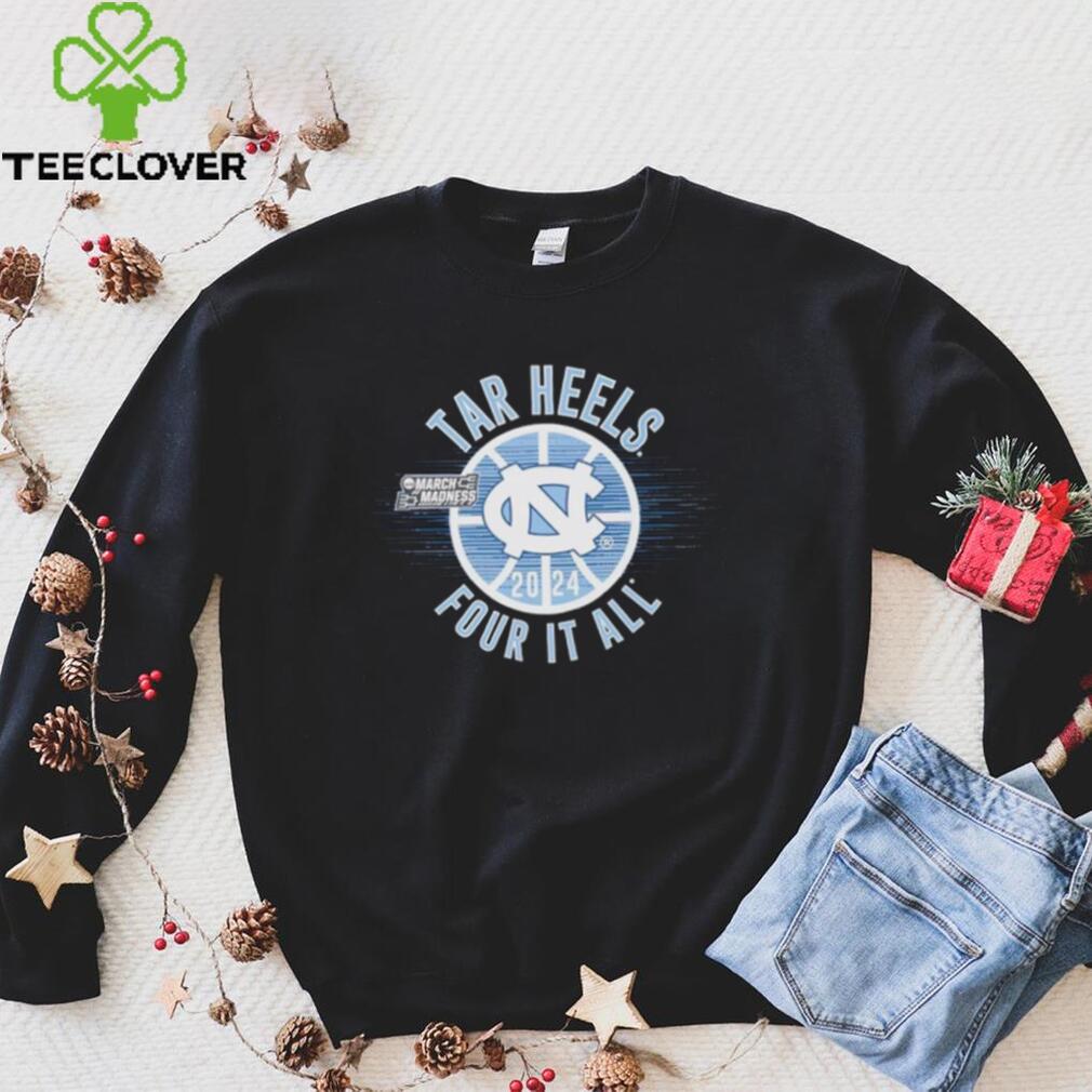 I don’t think it’s really March Madness Tar Heels 2024 four it all shirt that the mother should just give up the family celebration for a belief system that she doesn’t seem to understand. Christmas has a lot more going on than just the birth of Jesus, since that was brought about only to make the Pagans who have come into, or been forced into, the worship of the God of the Christians, more comfortable. A Pagan ( so called) celebration with an new name.