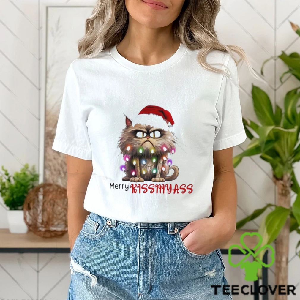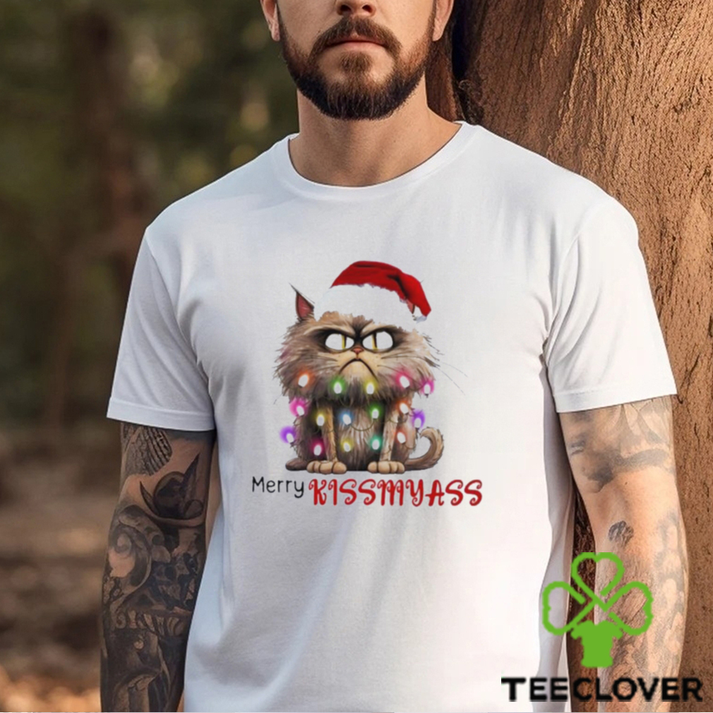 Merry Kissmyass Funny Cat Christmas Lights Shirt