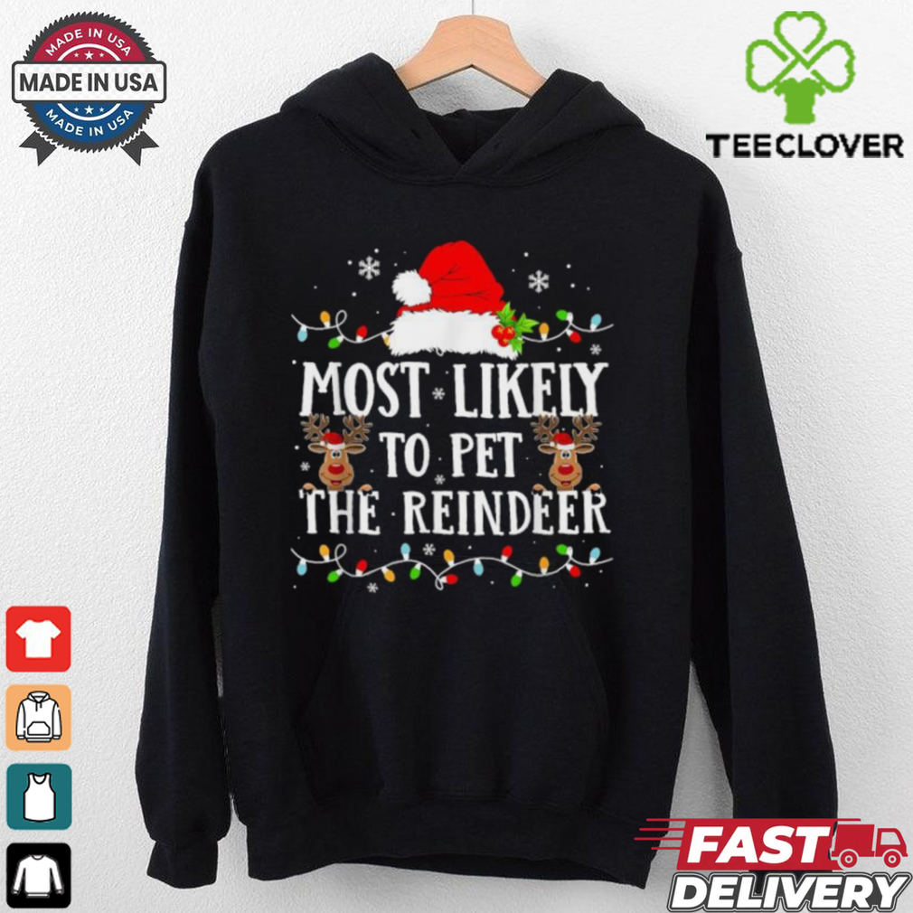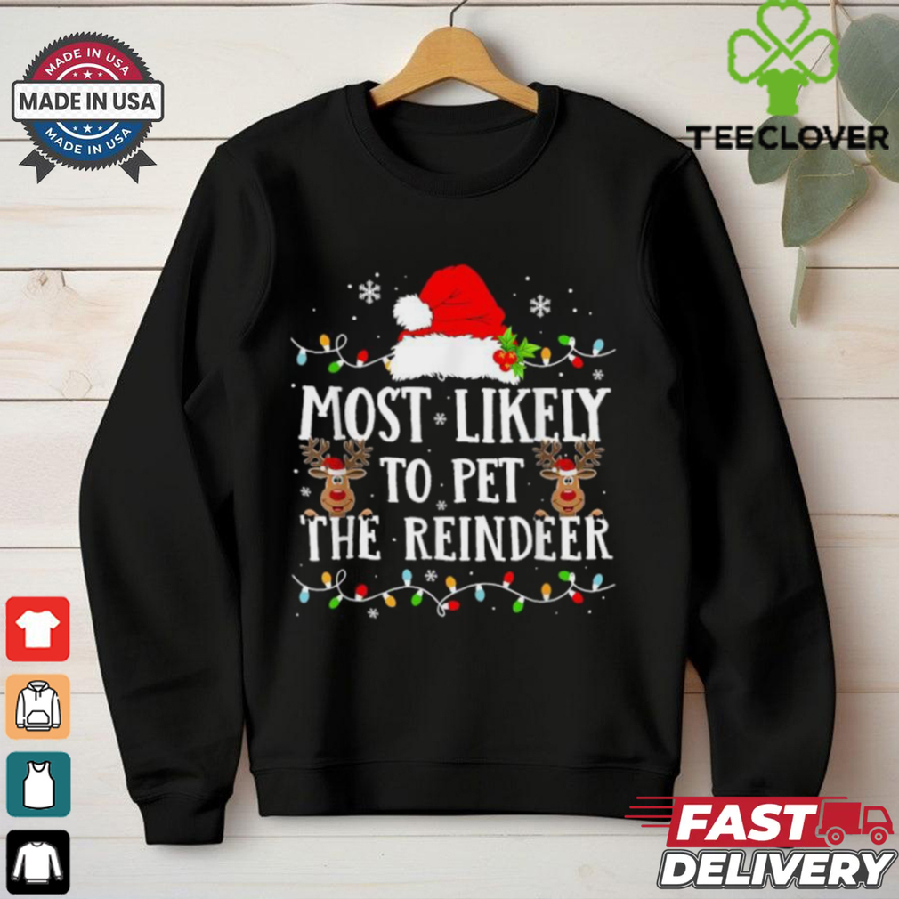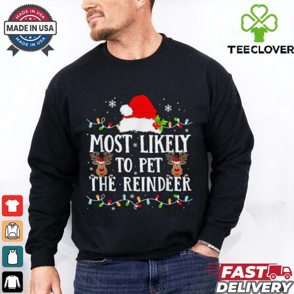 ()Most Likely To Pet The Reindeer Christmas T shirts hoodie, tank top, sweater and long sleeve t-shirt: best style for you