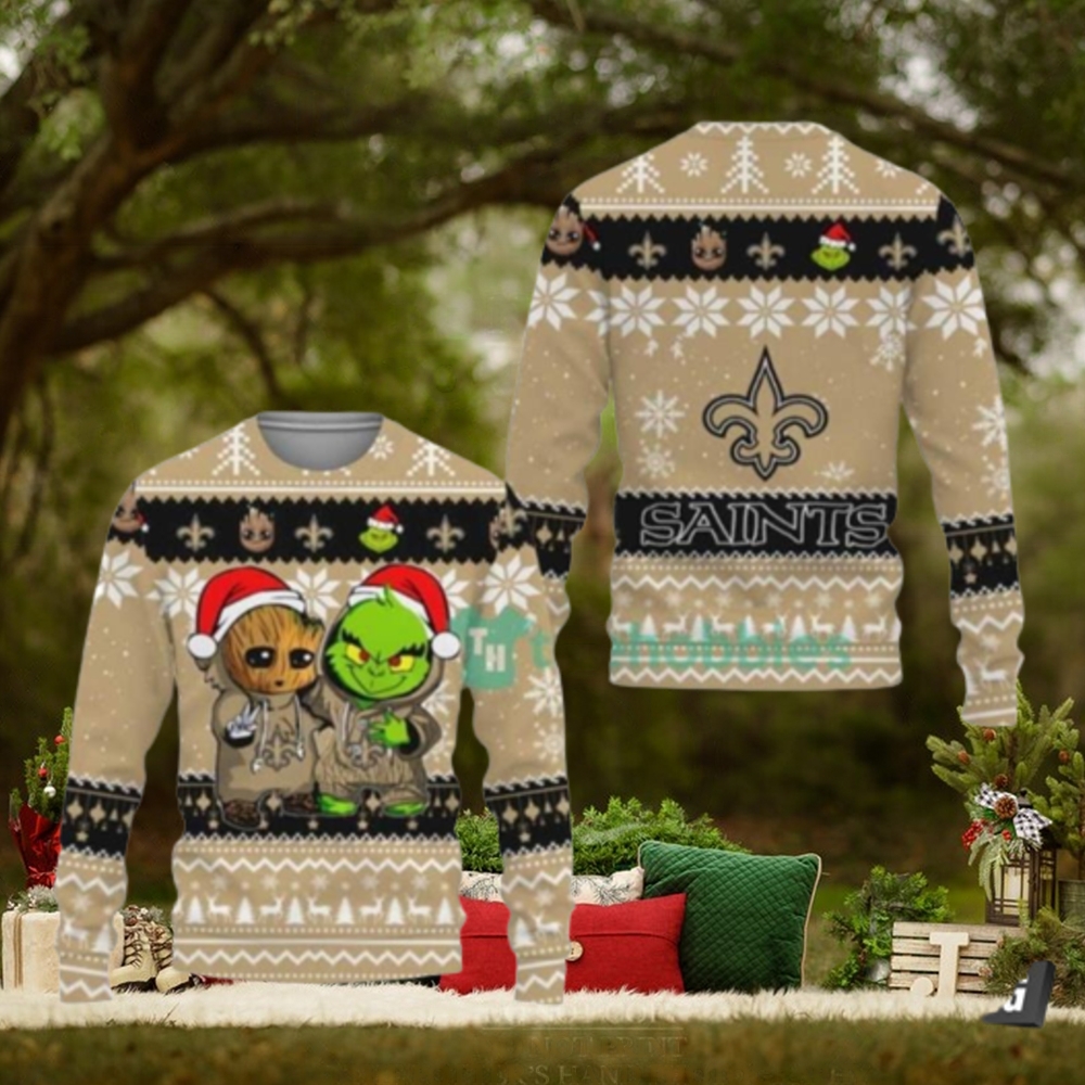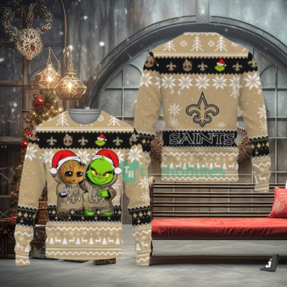New Orleans Saints Baby Groot And Grinch Ugly Christmas Sweaters