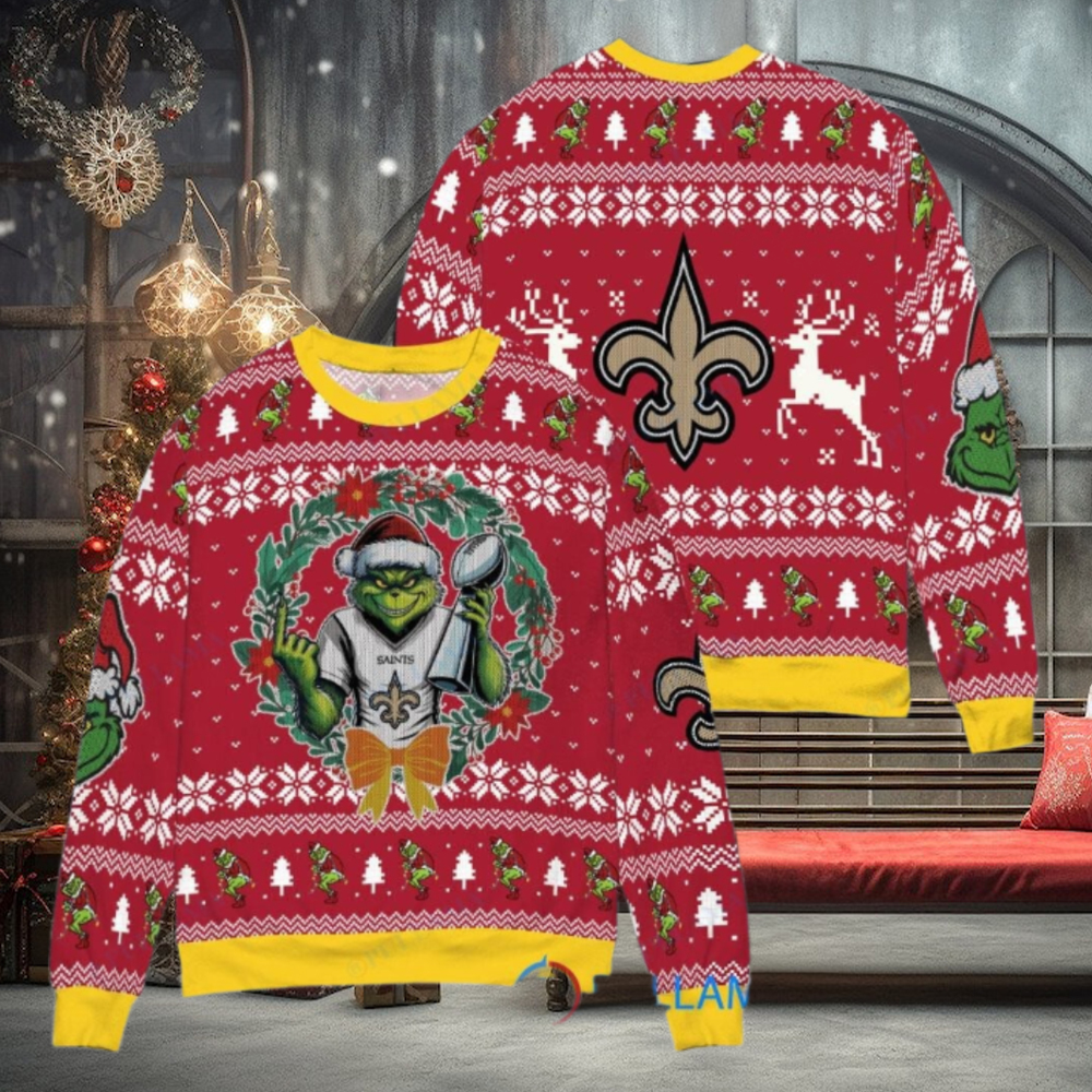Best New Orleans Saints x Grinch NFL Dr. Seuss How the Grinch Stole Christmas with Super Bowl Trophy Ugly Christmas Sweater Red