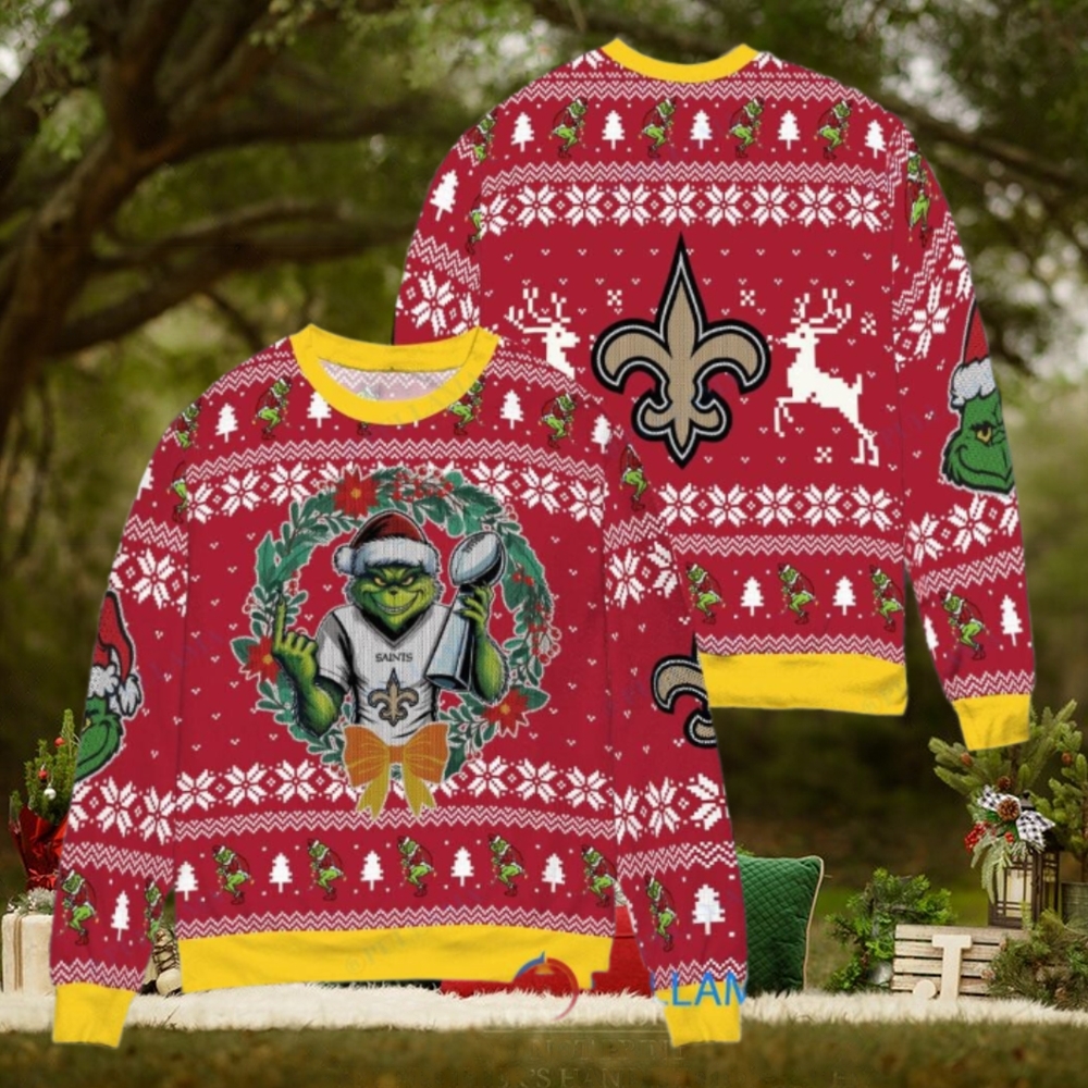 ()New Orleans Saints x Grinch NFL Dr. Seuss How the Grinch Stole Christmas with Super Bowl Trophy Ugly Christmas Sweater Red,