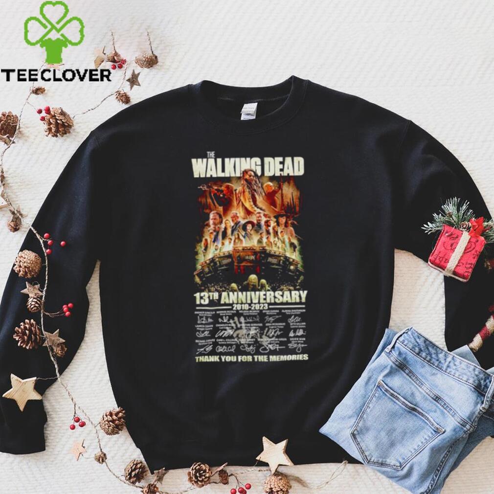 You can wear whatever you want, but remember: This is the office party. This is a New The Walking Dead 13th anniversary 2010 2023 thank you for the memories shirt of people with whom you work, so if you wouldn’t wear a revealing dress to work, don’t wear it to the office party. Also, don’t drink much you presumably know your limit, so stop well short of it. Because again—you work with these people. When I worked at TV Guide, senior staff regularly attended the Christmas parties, which (at least at the beginning) were lavish, usually held in off-site venues and allowed employees to bring spouses. You don’t want your boss’s boss asking who that was—the girl in the thigh-high bandage dress and hooker heels or the guy who threw up on the white-glitter sparkle Christmas tree. Women get the brunt of the judgmental post-party gossip about attire while men generally have to do something memorably bad, but I imagine a male manager showing up in gold lame hot pants would cause a stir in most business environments.