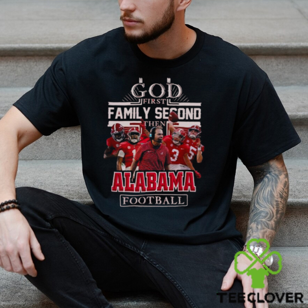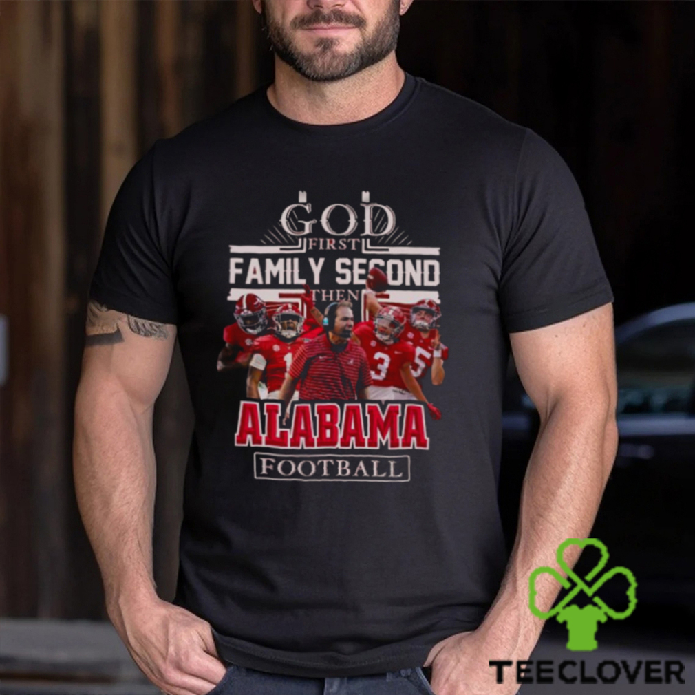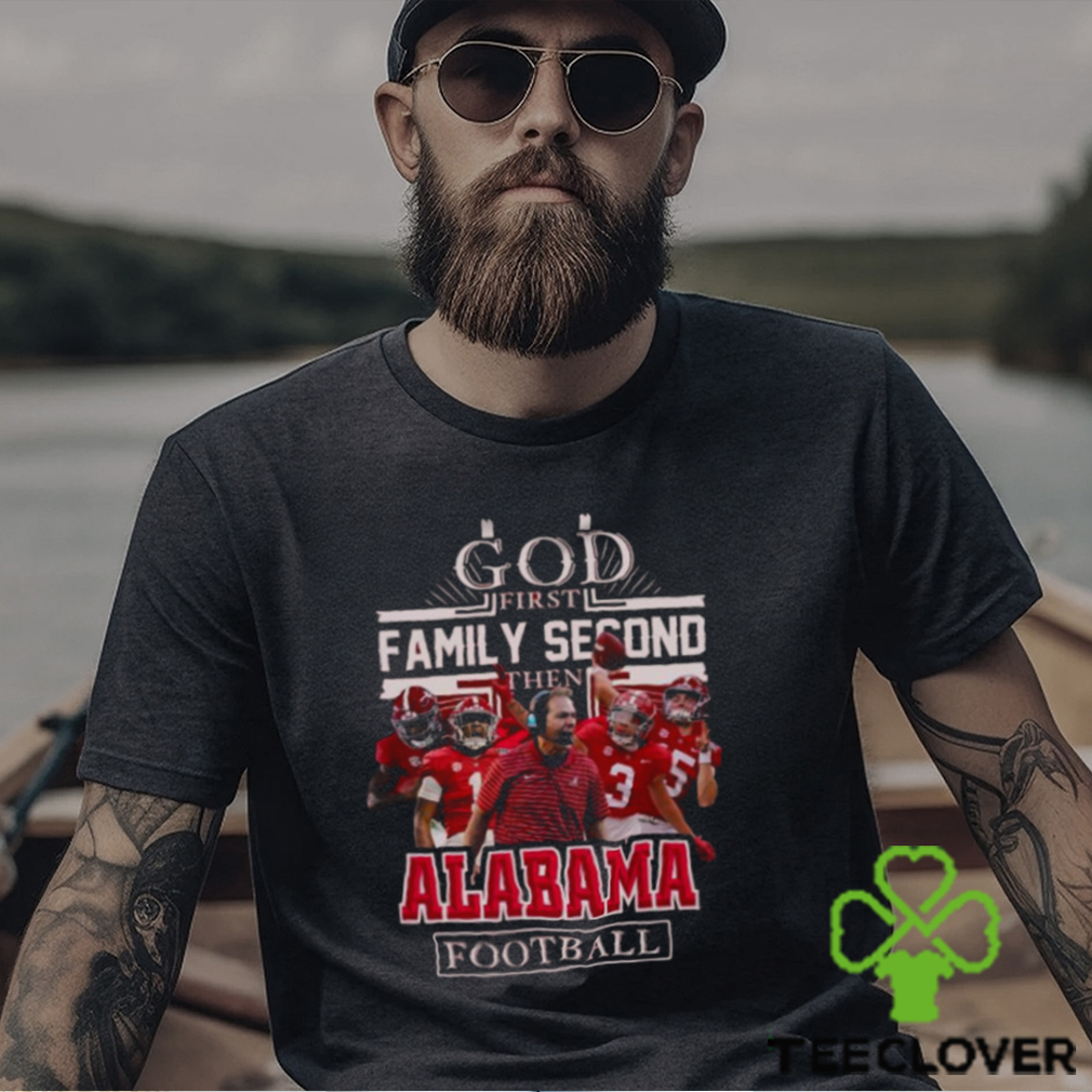 A NFL God First Family Second then Alabama Crimson Tide Football 2023 Shirt is that replacing one of these legacy systems is like βchanging the tire on your car while itβs in motion.β But, that analogy really doesnβt describe the complexity of the problem at all. Imagine having to replace your carβs frame while itβs in motion. The corporation canβt take a year off to do this, it needs to continue down the highway without sputtering while you replace the framework that not only holds the wheels in place, but restrains the powertrain, protects the driver, holds the wires in place, and keeps the road from rattling everything apart. I witnessed several attempts to replace these systems. Each team was given a large budget and told to make it happen. Spirits of young programmers were dashed against the rocks again and again by these projects. They eagerly dove in, and documented all of the functions that are performed by the legacy. Then they began to build replacement systems that must run in parallel to the legacy. Until the project is completed, these replacements must pipe information into and out of the legacy while establishing an entirely new framework.