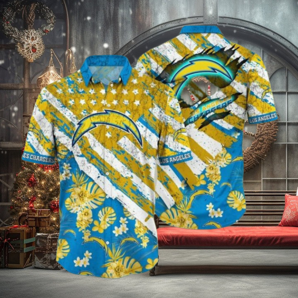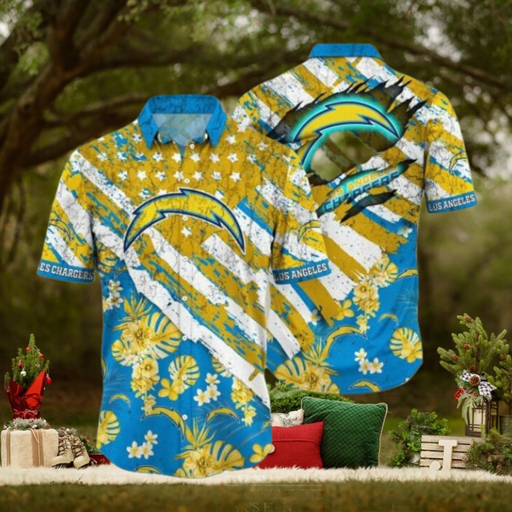()NFL Los Angeles Chargers Gold Flowers Blue Hawaiian Shirt V2,