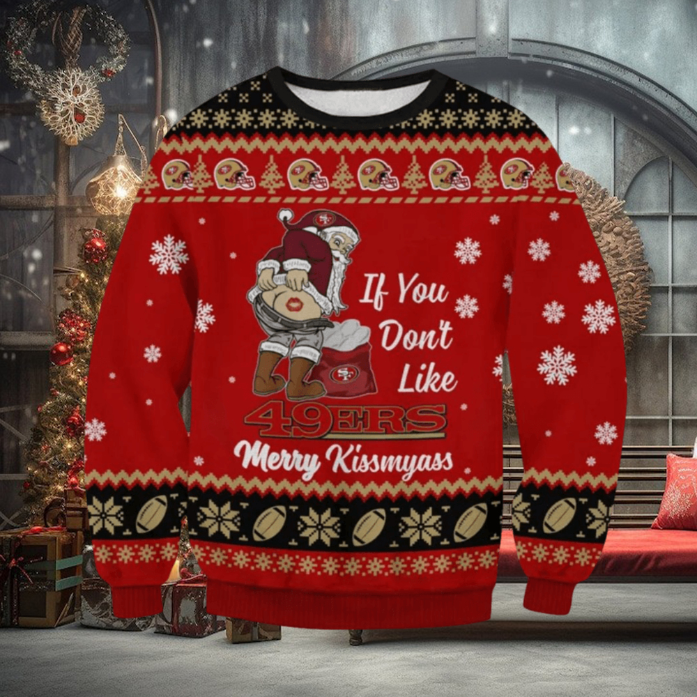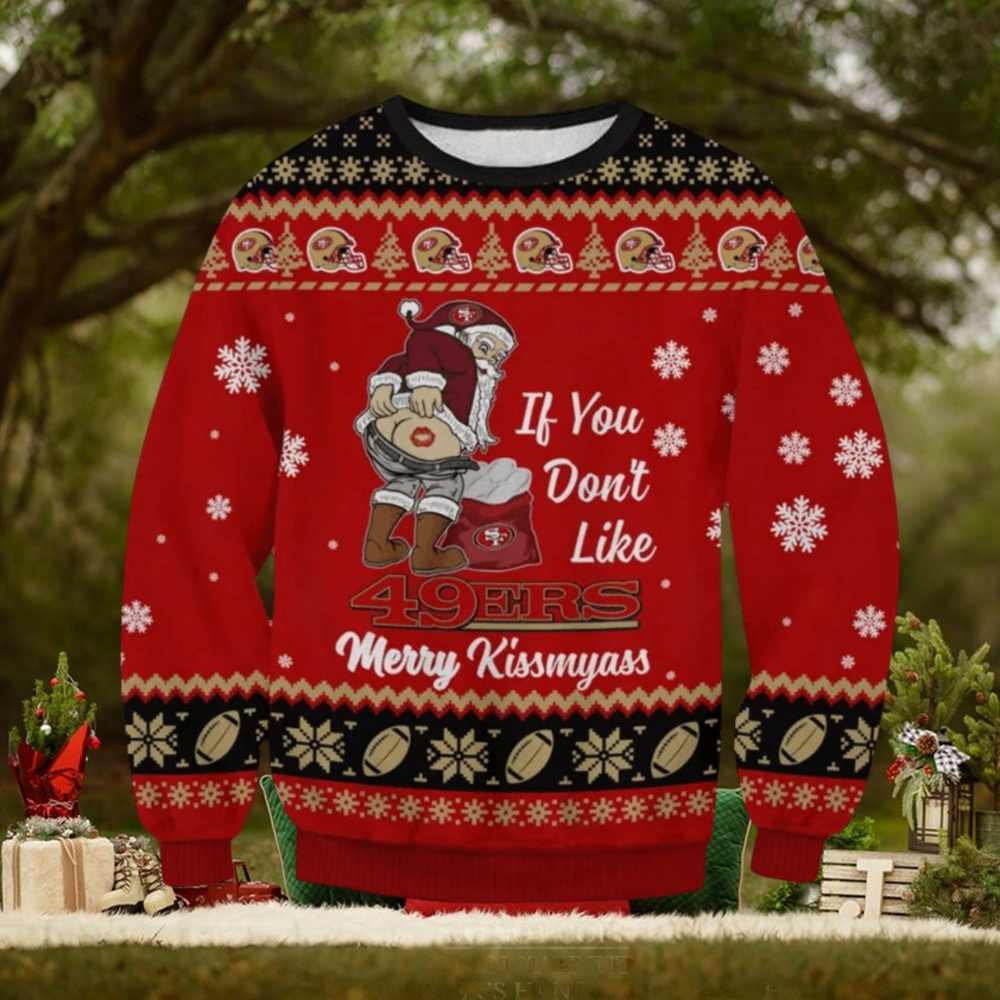 Spygate, 2007: New England Patriots get caught stealing signs from opponents` sidelines. This was actually not against the rules yet, so technically not cheating. They changed the NFL San Francisco 49ers Santa Merrykissmyass Ugly Christmas Sweater after this to make it illegal. I won`t deny it`s a bit cheap (although you`re kidding me if you think the Patriots were the only team doing this), but not nearly as egregious as:Deflategate, 2014: During the AFC Championship Game, the New England Patriots were found to have several footballs in their arsenal that were below the legal minimum. Tom Brady had to testify before Congress and was suspended for four games the following season, despite the fact that the Colts, the team that Patriots beat in the game 45β7, noted that they didn`t lose because of the NFL San Francisco 49ers Santa Merrykissmyass Ugly Christmas Sweater, and that the Colts had deflated footballs as well. For context, the weather was super icky that game, and it`s probable that both teams deflated the footballs to grip them better.