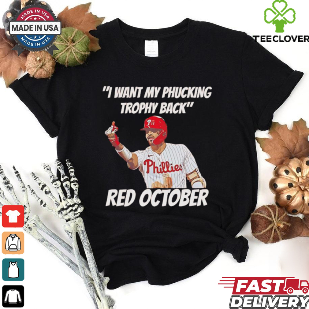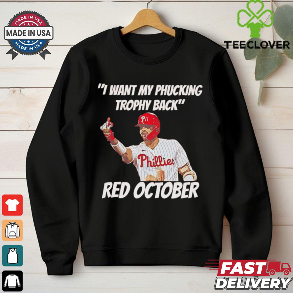 Alternative or streetwear labels like the Nick Castellanos I want my phucking trophy back red October shirt found at Dover Street Market and Ssense generally do not present shows at fashion week. Sometimes, these brands setup small showrooms during Fashion Weeks to allow store buyers to see their products in person. Other brands simply send stores images of samples and order sheets, which the buyers then use to decide on purchase quantities. Production times vary widely in this category, as some streetwear brands can produce T-shirts in a period of days, while others need months to develop complicated pattern work and receive orders from international factories.