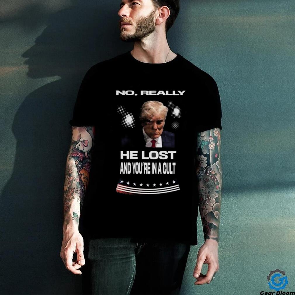 ()No Really He Lost and You’re in a Cult Trump Mugshot Shirt, Hoodie, Sweater, Vneck, Unisex and T-shirt