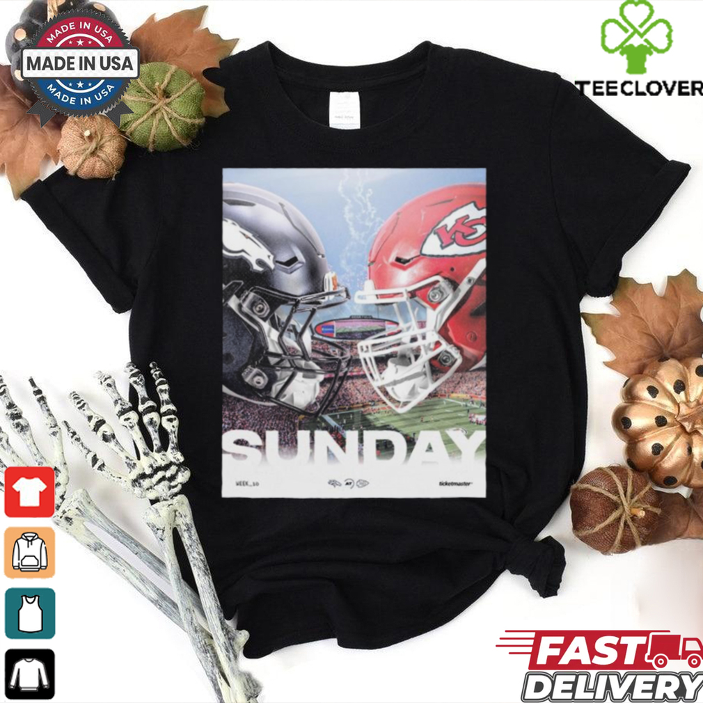 And isn’t βnot all men” used as a shield to cancel rules for Official Denver Broncos vs Kansas City Chiefs Week 10 2024 AFC West battle Shirt proof of a level of duplicity from the men saying this? Any man who honors men knows that men, like my son, are completely developed and capable human beings that won’t crumble under the rules held to girls. I challenge men to not use βnot all men” for ANYTHING but a man’s issue for one whole month. Don’t say those words except to say βnot all men think women are cargivers” in a case where a stay at home dad is proving he’s the best parent for his children as he was raising them at home.