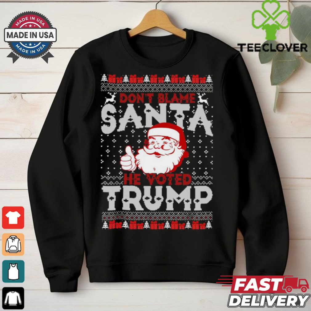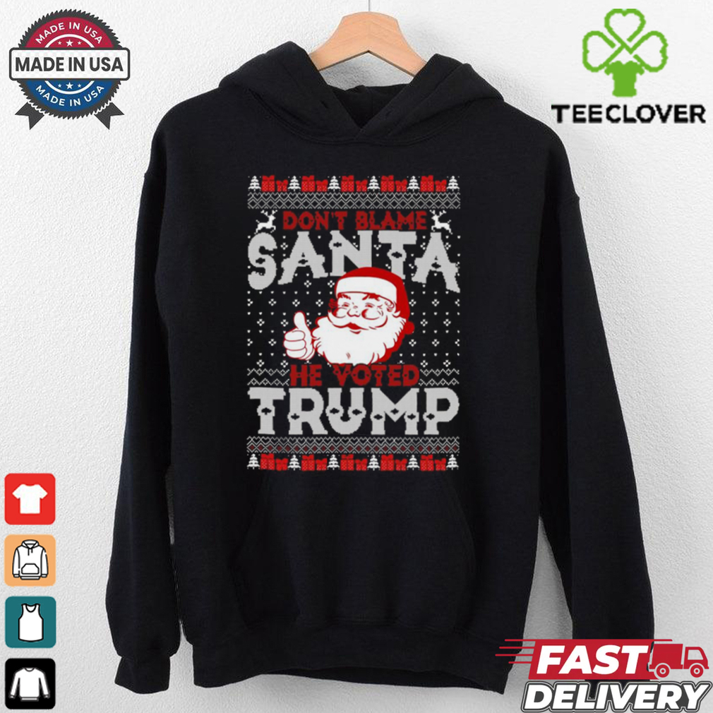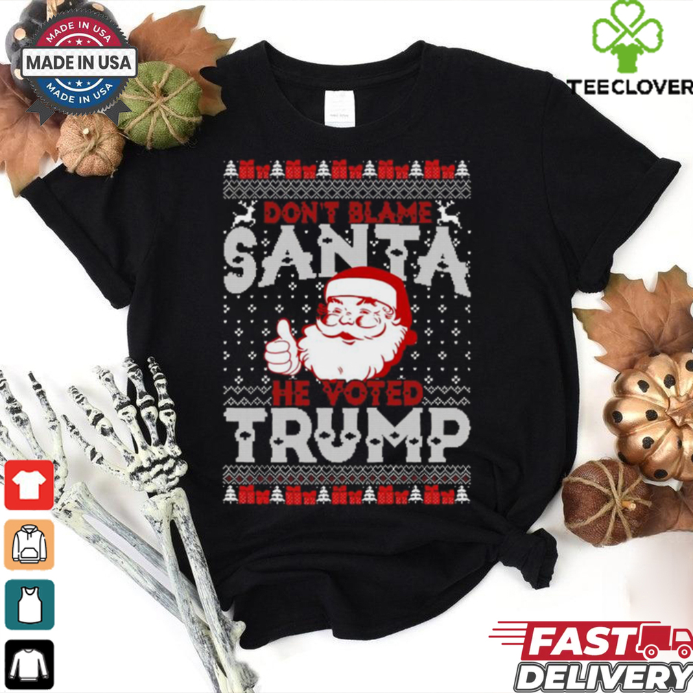 Now choosing a bra is a very Official Don’t blame Santa he voted Trump Ugly Christmas 2024 Shirt job dictated by various factors, mainly the hours of use, the type of use, the scenario or occasion and breast size. Being unaware of your size its a pretty tough choice to make but in general you should have pair of bras for regular use, used alternately and some other ones suited for specific purposes.I felt like every eye in the flight was staring at me and trying hard not to open the doors and throw us out. No one could blame them. The smell was horrible it could have blown your nose off.