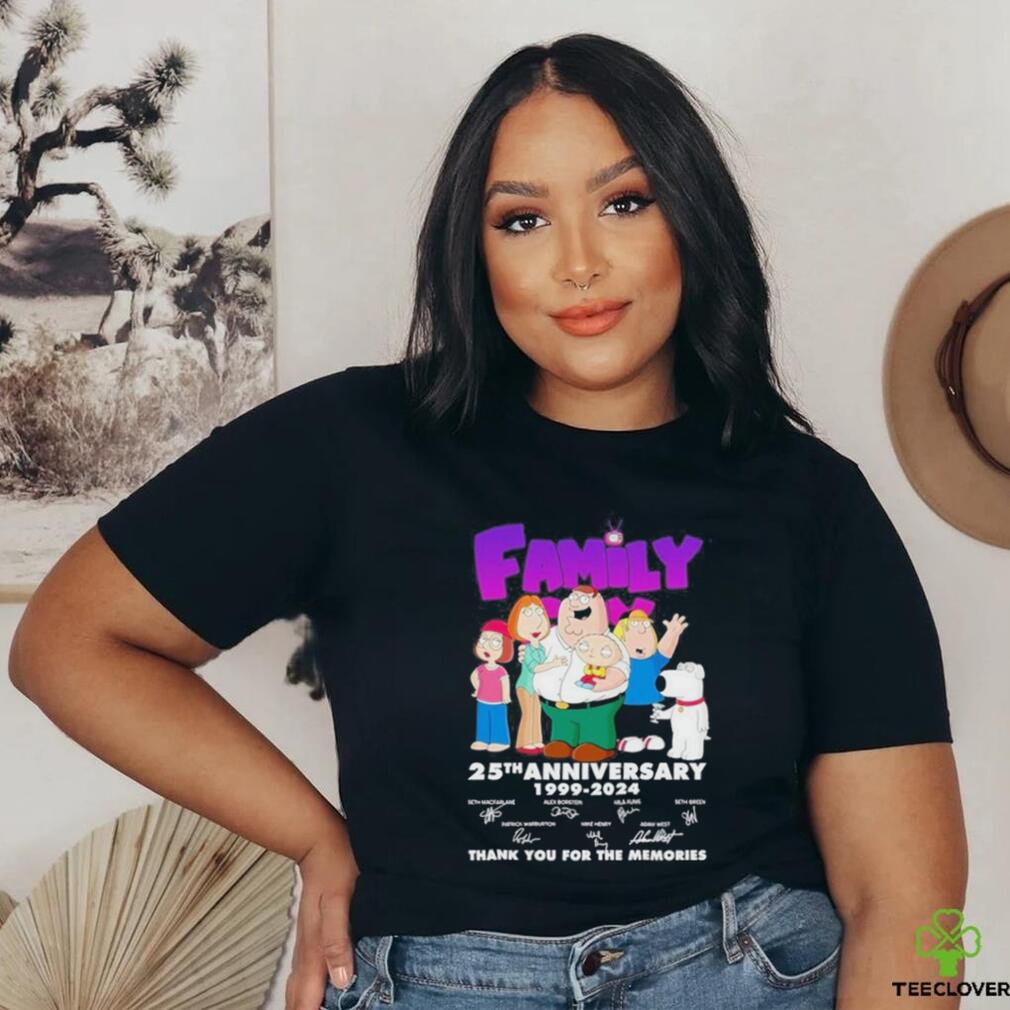 As a consequence of this, the majority of his army became Han, who not only stayed on the Official family Guy 25th Anniversary 1999 – 2024 Thank You For The Memories Shirt but also leveled up to the middle and high ranking military officers. If you’re familiar with the Roman Empire politics and certain parts of Eastern Asian history, this means that the Emperor can no longer became the Emperor and even the general cannot be the general without the military officers’ supports. These officers became the most important interest group and backbone to back up kublai and the Yuan dynasty. Of course, they were also extremely arrogant and annoying and not afraid of murdering their generals or started a rebellion if they were paid less. Their pattern of behaviors brought down the Tang Dynasty, such that the Song Dynasty had to oppress them in order to maintain the unity and power, which resulted in the extreme weak military forces against others including Mongolian. Ironically, the way of the Yuan dynasty and the Mongolian kept their dominance was as same as the Tang Dynasty’s strategy by granting these military leaders the great power and benefits. The history basically circled back at that moment.
