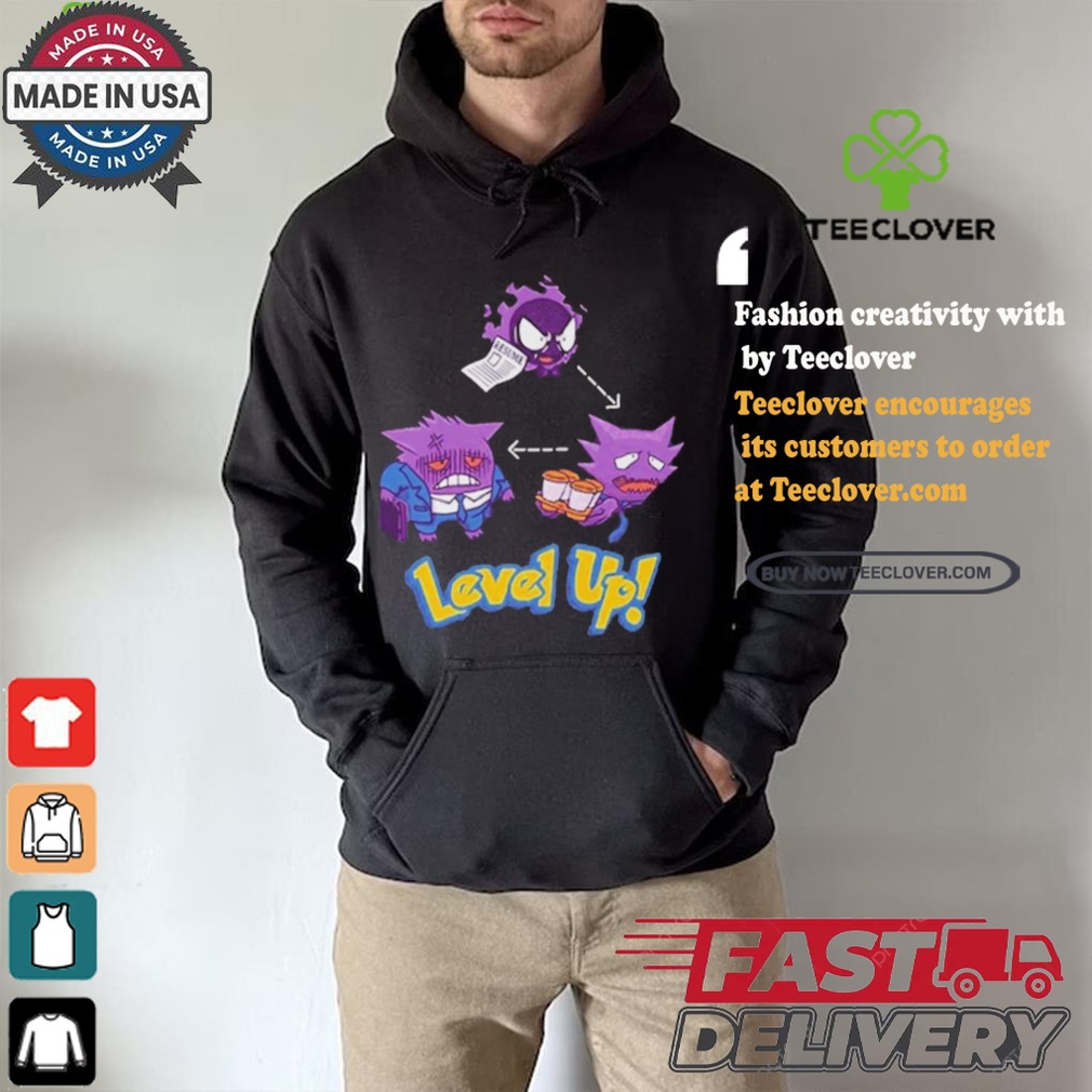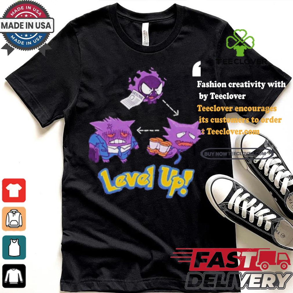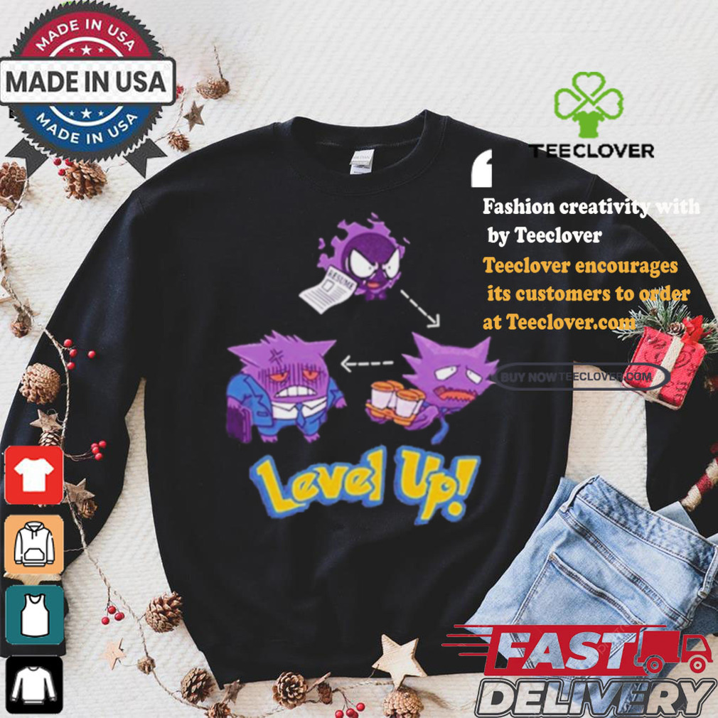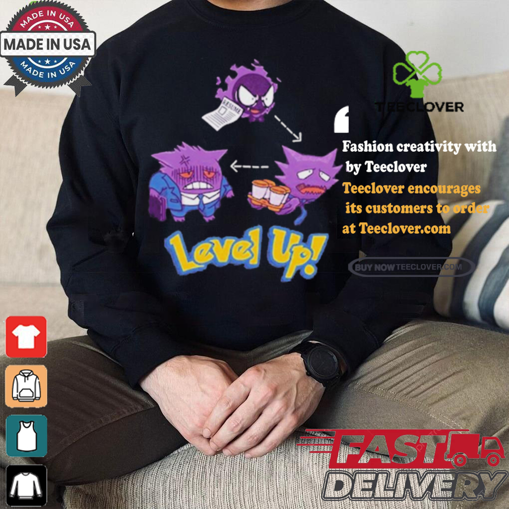 I was hoping Delores wouldn’t become a Official Gengar Pokemon Level Up Shirt aggressive rooster, as my recently deceased “Lance” had been, before passing on to “rooster heaven” with the assistance of a local coyote. The rooster I currently had, Gordon, was a sweet boy and was very happy to have Lance gone. Lance had been a fierce rooster who attacked literally every moving thing but the hens and me (displaying extreme good taste and discretion) and I was not prepared to live through as second several years of yet another “attack rooster”. Neither were the neighbor dogs. Nor were the neighbors, for that matter. I really didn’t think this would be a problem, as Delores was such a sweet rooster – showing no violence or aggression at all, and just wanted to sit on my shoulder (rather like a parrot) and look around. He’d snuggle against anyone’s neck or in anyone’s lap who would hold him and he adored being petted. Delores ran around digging for bugs in the lawn – but was just as happy sitting by the kitchen sink watching me trim vegetables or whatever. He made (as all my chickens did) a truce with the cats and was friends with the goats, horses and my other rooster, Gordon. They all slept together in the barn at night.
