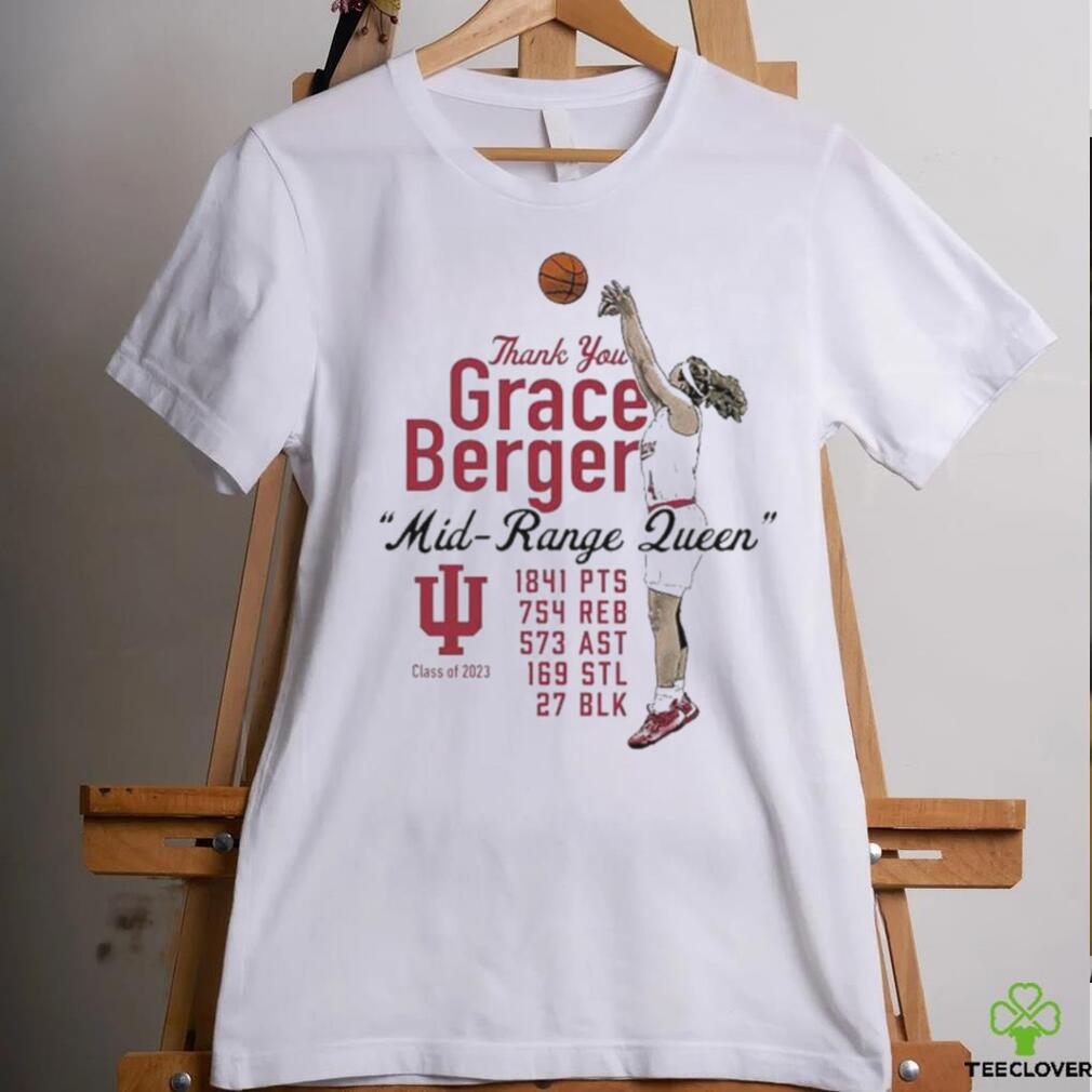The Marvel Studios movies are known for Official indiana Women’s Basketball Limited Grace Berger Thank You shirt, light hearted tone, and easy going nature. Like the first film, this film had jokes in it. But I found myself not laughing. A few worked, like when Mantis got hit by falling debree in the final third act battle. But Rocket’s humor was not funny, Star-Lord and Gamora flirting did not amuse me. Sure- some things were funny- some Baby Groot moments were hilarious, that Mantis scene again, Drax and Mantis had a few funny scenes, and when Star-Lord and Rocket were arguing about tape- I guess that was funny, but other than that- most jokes just didn’t land. It was a shame, cause the first movie was so damn funny. But this movie was also so slow. There was barely any action. Majority of the film takes place on Ego’s Planet, and shows Drax falling in love with Mantis, Peter and Gamora getting closer together, and Peter getting to know his father. Whilst the relationships would otherwise be interesting to watch progress, they didn’t progress in the way I wanted. It was really Rocket, Baby Groot, Yondu and Nebula- they are the main characters in this film- Peter, Gamora, Ego, Drax and Mantis all are backseat players for this film. But the action we got also felt lackluster and had way too much CGI, almost like a DC movie. It was either too little action, or too much CGI in the action. The only good action pieces were between the sisters Gamora and Nebula, who had a great cat & mouse story in this film.