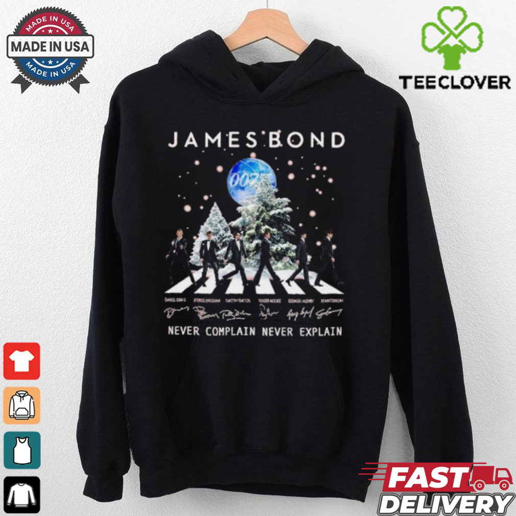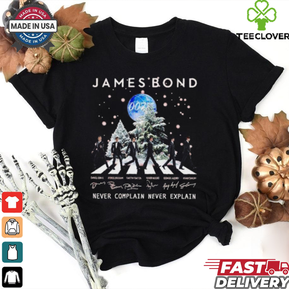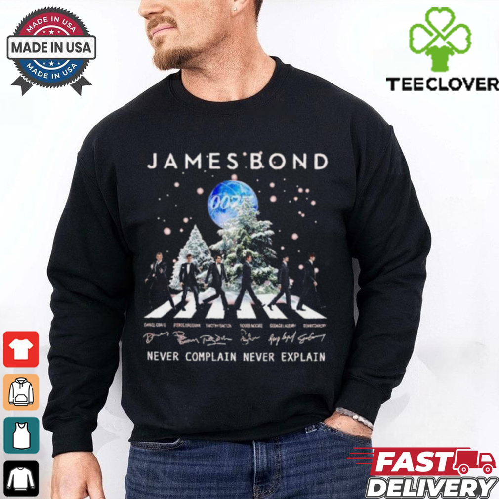 Through carrying out any type of or even Official James Bond 007 Abbey Road Never Complain Never Explain Christmas Shirt one of these 3 peculiar points, you push your eyes as well as your mind to keep an eye on the voids in between the characters instead of attempting to check out words on their own. Words come to be intellectual designs to your mind, as well as you, the t t-shirt performer, are actually free of cost to adequately evaluate the voids in between words Port Coquitlam.