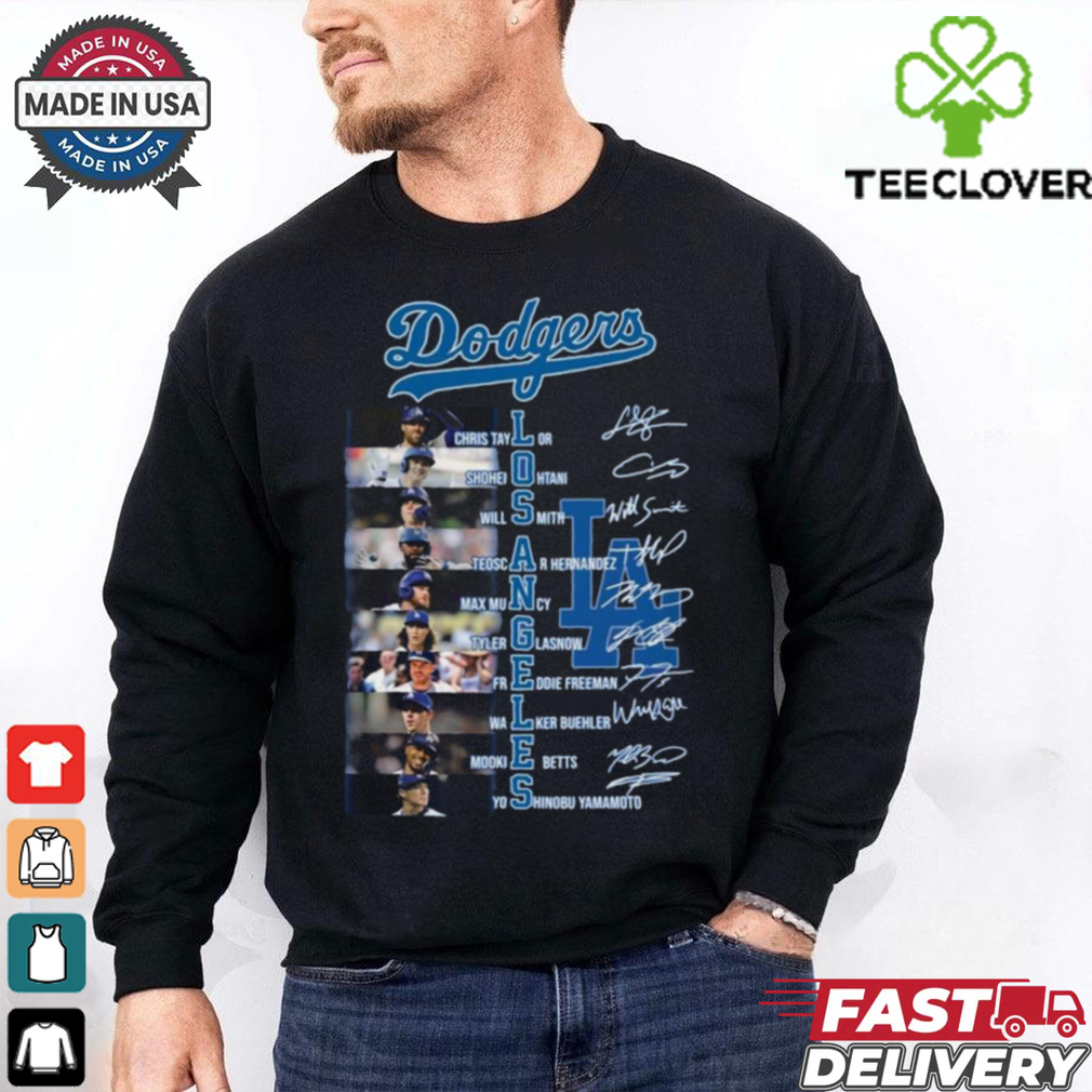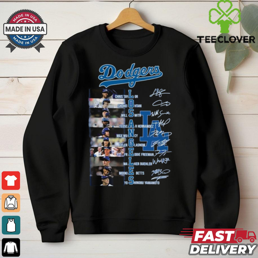 ()Try to only shop in the menβs section if it has what you Official Los Angeles Dodgers Team Players Names And Signatures 2024 Shirt , because they change things between the gendered sections that are very subtle but add to people clocking other peopleβs gender: The shape of tennis shoes, the side of a shirt the buttons are on, the stitching of jeans, etc. A lot of dumb, tiny changes that add up.If your top/tshirt is too fit for you. It is almost impossible to get a complete seamless finish, but you can definitely reduce the outlines by using seamless bra. If you are small breasted you can try sports bra. With wider back. If they are on bigger side light padded bra.