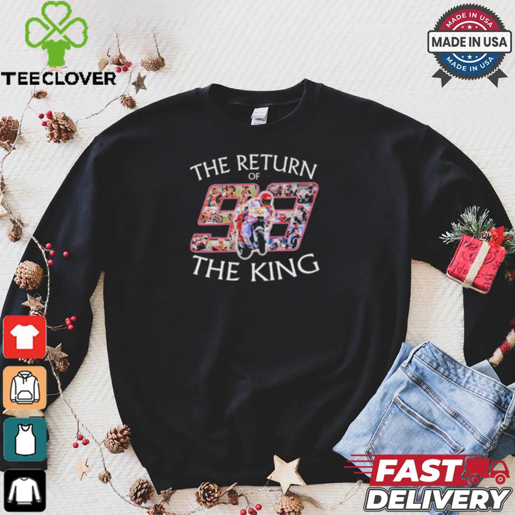 I do not remember Christmas Day itself that year, but the events around theOfficial Marc Marquez The Return Of The King 2024 T Shirt this holiday changed my life forever. I was living in Los Angles at the time and was dirt poor as I was very underemployed. I did not have any ambition, but was content. I had a new girl friend (we had been dating for not yet six weeks). I was too poor to buy a Christmas tree. It had been raining for about a week, and was expected to raining for the next week (for those of you that do not know the weather for Los Angeles, this was highly unusual). Three days before Christmas I was driving around with my girlfriend doing some last minute Christmas shopping, when an announcement came on the radio that they were giving away free Christmas trees at a location about one half mile from where we were. I looked at my girlfriend and she said, βYes, letβs go get a Christmas treeβ A couple left turns later, there we were. There was a truck with two trailers full of Christmas trees trying to give them away. The owner of the property where the truck was park had call the police and wanted them to be charged with trespassing. He had Christmas tree lot down the street and this was killing his business.
