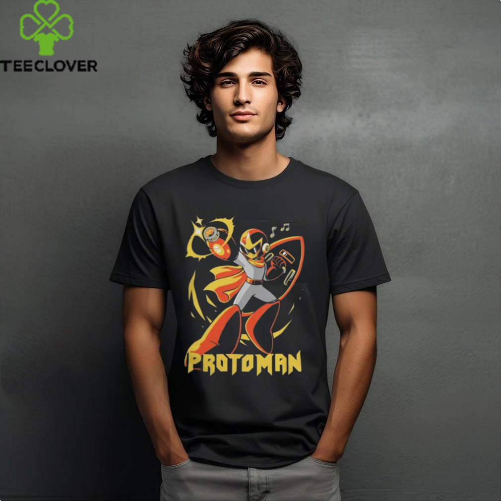 Rugby League may be the easier game to play in terms of learning how, but it has a Official Mega Man Heavy Metal Proto Man T Shirt cardiovascular fitness requirement compared to the NFL โ and higher than that of Rugby Union. An NFL game of 60 minutes takes about 3 hours to play, with multiple personel changes. Many NFL players are simply not fit enough to play either Rugby code, where the minimum fitness required is to play 40 minutes straight and a further 20 minutes after a 15 minute half time break. League is especially demanding on fitness because the ball is in play for a higher percentage of that time. From what I’ve seen, a lot of NFL players would require a year of physical conditioning to play rugby to any decent level.
