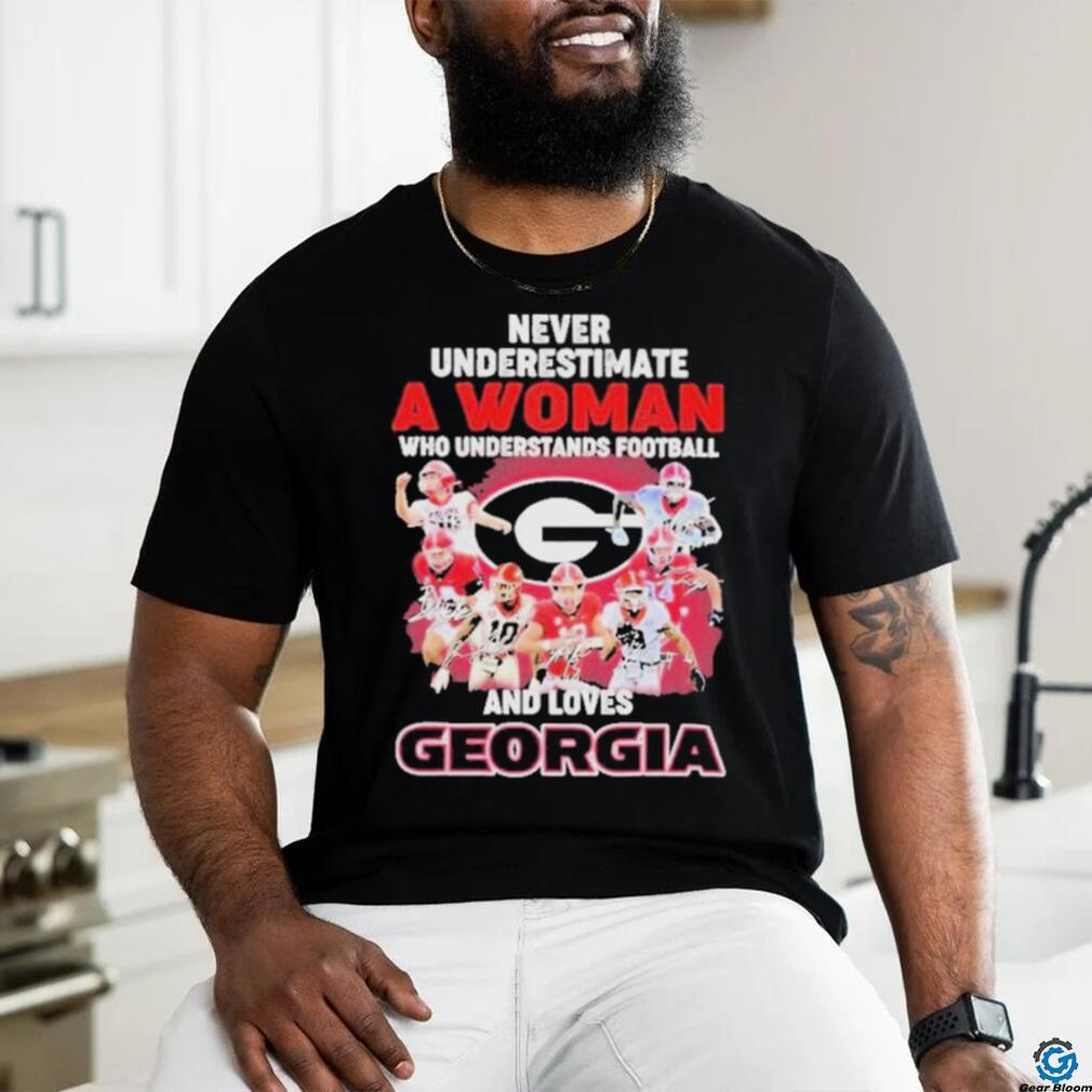 Official Never Underestimate A Woman Who Understands Football And Loves Georgia College Football Signatures Christmas T Shirt0
