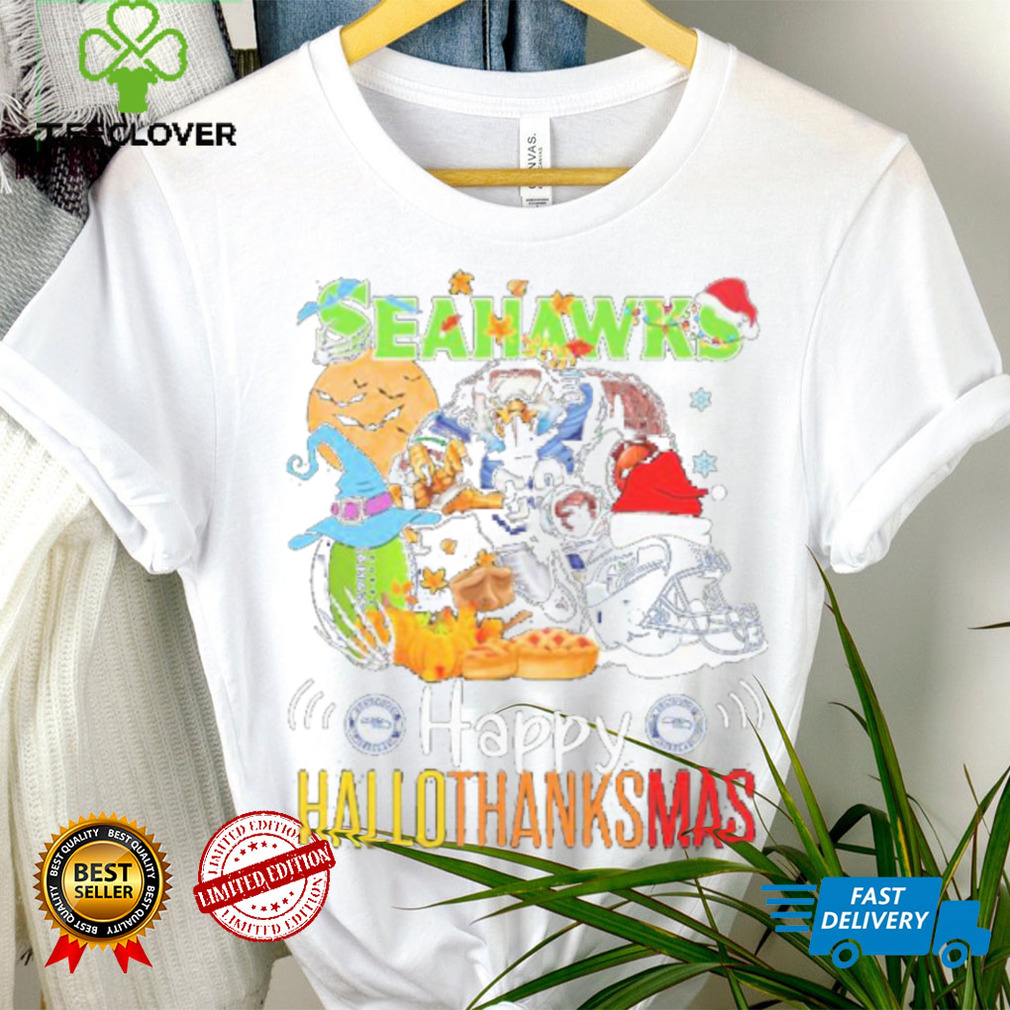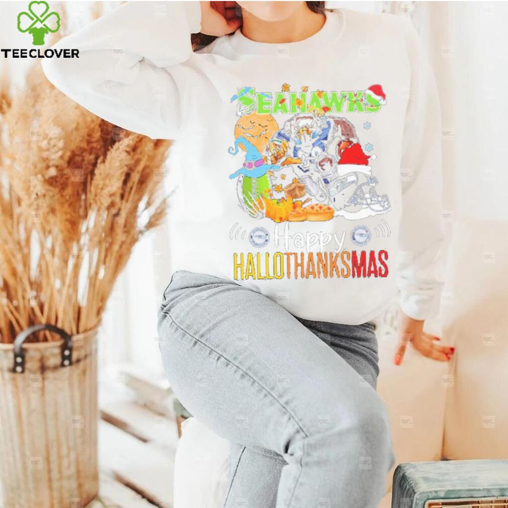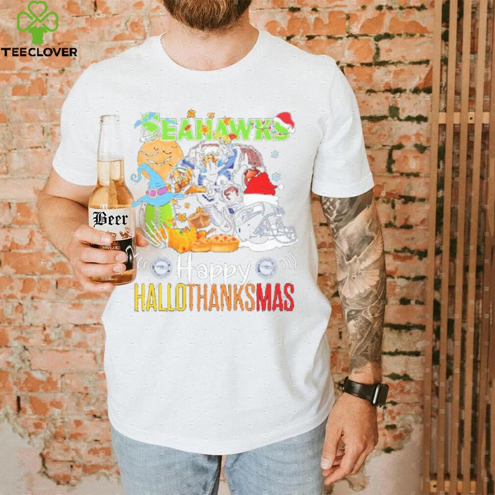 Christmas begins at midnight on the Official NFL Seattle Seahawks Happy Hallothanksmas Shirt of 24 December (the beginning of 25 December). One should not begin putting Christmas decorations up until Christmas Eve. Christmas Day lasts a full eight days, and ends on the first of January – the Octave Day of Christmas. The season of Christmas lasts until Epiphany on the 6 of January, so your decorations should stay up[ that long, and the Christmas Marian antiphon gets sung until the first of February, so you may take your Christmas decorations down at the end of January. Please, please, please do NOT put Christmas decorations up during Advent. Advent is the Penitential season which encompasses the four Sundays before Christmas, so it begins right around the end of November. To repeat, Advent is a PENITENTIAL season, so nothing of Christmas should intrude on Advent other than preparation – spiritual preparation for Christmas, going to confession each Saturday, saying extra prayers, going to daily Mass, etc. All would be excellent preparations for Christmas, but do NOT start celebrating Christmas itself until midnight at the beginning of 25 December!